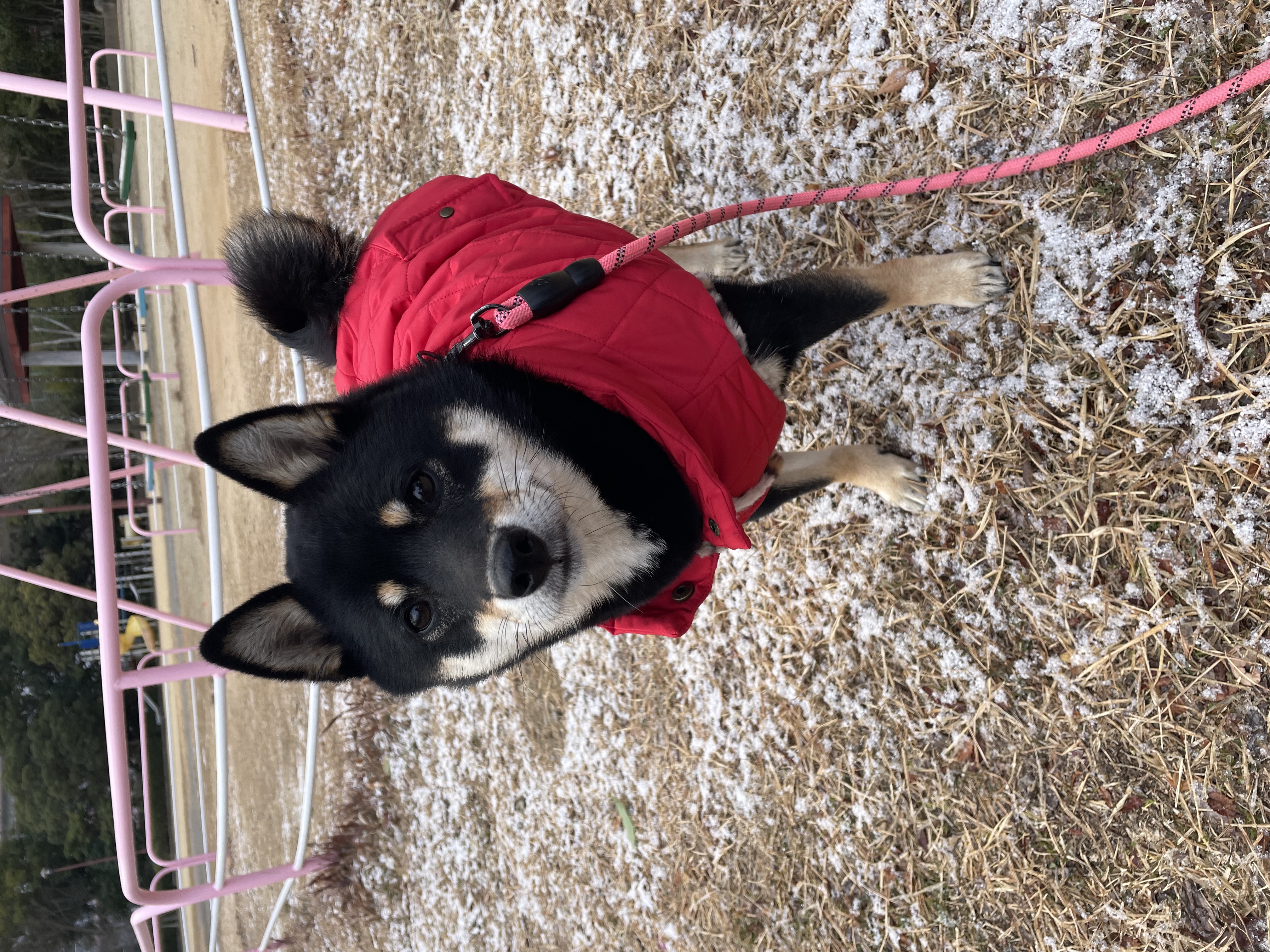 手を通すのが苦手なので、めっちゃ怒られますが、可愛い!と褒めながらだと着てくれます。 黒に赤が映えて可愛いし、チラ見えするアニマル柄がオシャレ笑 柴は寒さには強いと思いますが、我が家周辺はとても風が強いので、そんな日でも気にせずお散歩が出来ました。 サイズは首回りがちょっと窮屈なので、お腹だけスナップ止めてます。