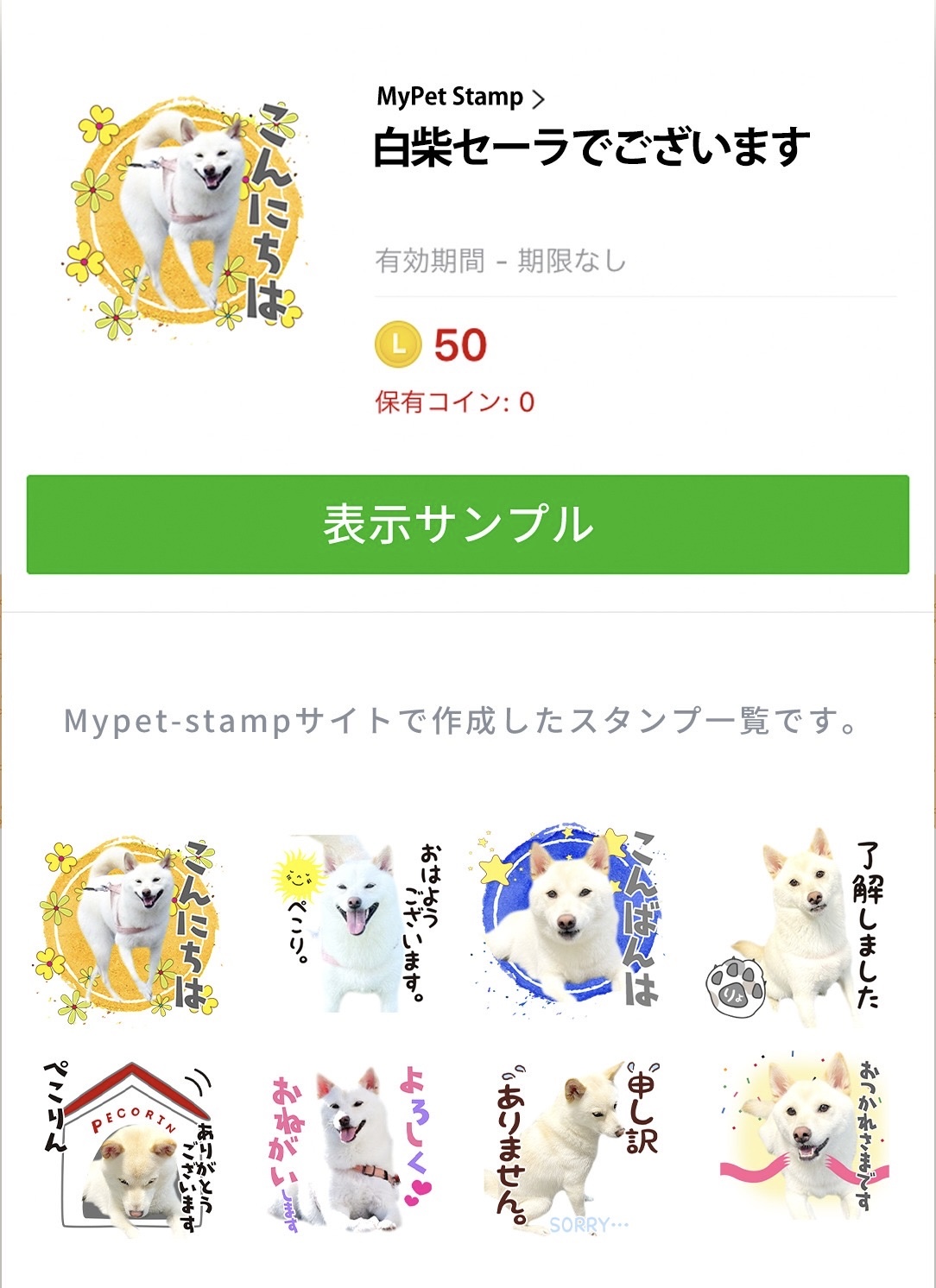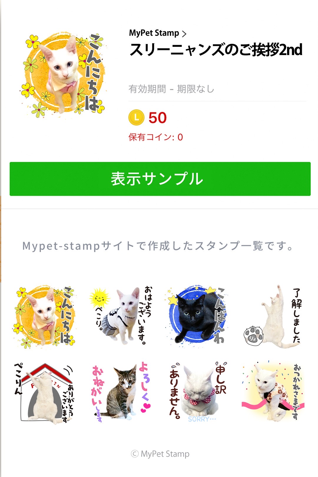 受け取ったスタンプは、通常のLINEスタンプのように50コインでプレゼントしたり自分以外の人が購入できるようにURLを送っていただけます。早速、家族みんな購入したので、これから活用していきたいと思います。