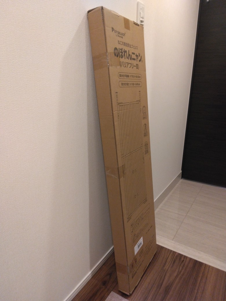 大型商品ということで身構えていましたが、届いた段ボールは縦120㎝、横33㎝、幅7㎝、とてもコンパクトでした。組立は簡単でしたが、天井が高いので、突っ張り棒の調整が難しかったです。しかし、これで玄関からの脱走が阻止できると思うと、購入してよかったです。