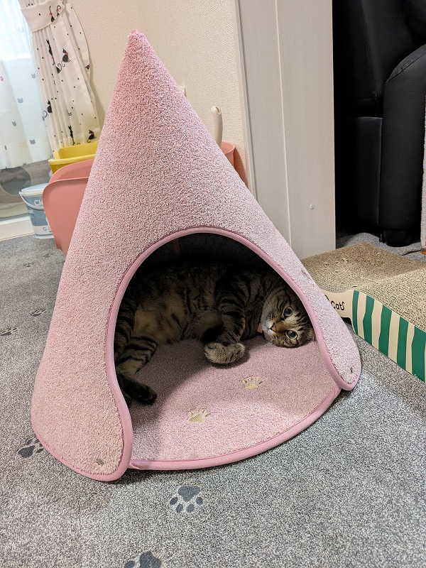 同シリーズのマットを購入する時に見つけて、ハウスタイプの寝床が好きな愛猫に購入しました。組み立てから興味津々でいつもの定位置に設置したら早速入ってくつろいでいました。このあとフワフワのブランケットを中に敷いてあげました。今は毎日入ってくつろいでいるので購入して良かったです。デザインもかわいくてお気に入りです。