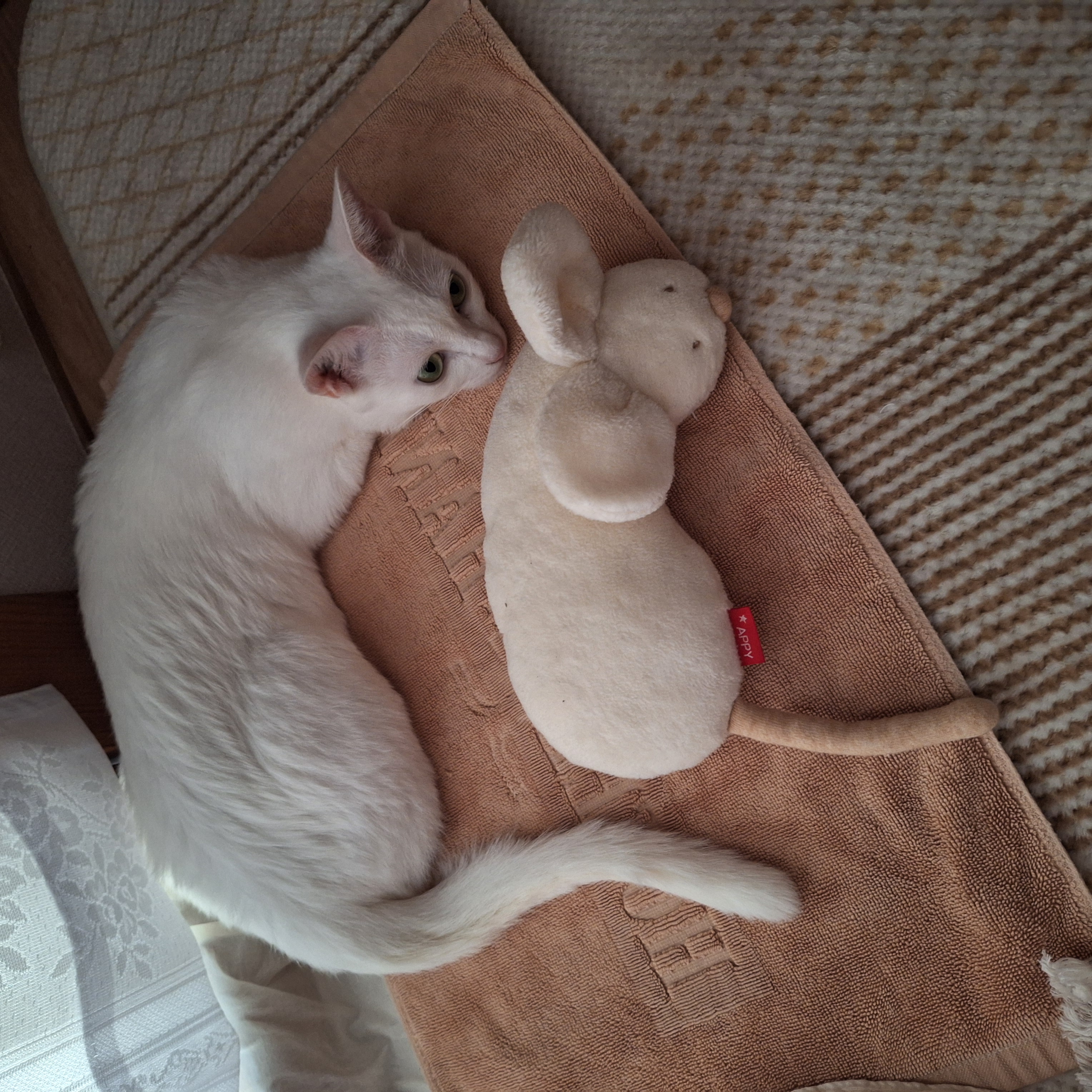 初めは反応しなかったのですが、最近はマタタビパウダーかけたら、蹴り蹴りしてる。噛んだりするので、安心素材が一番ですね。余談ですが、私も家族も、うちの白いお嬢様と見間違う時があります。