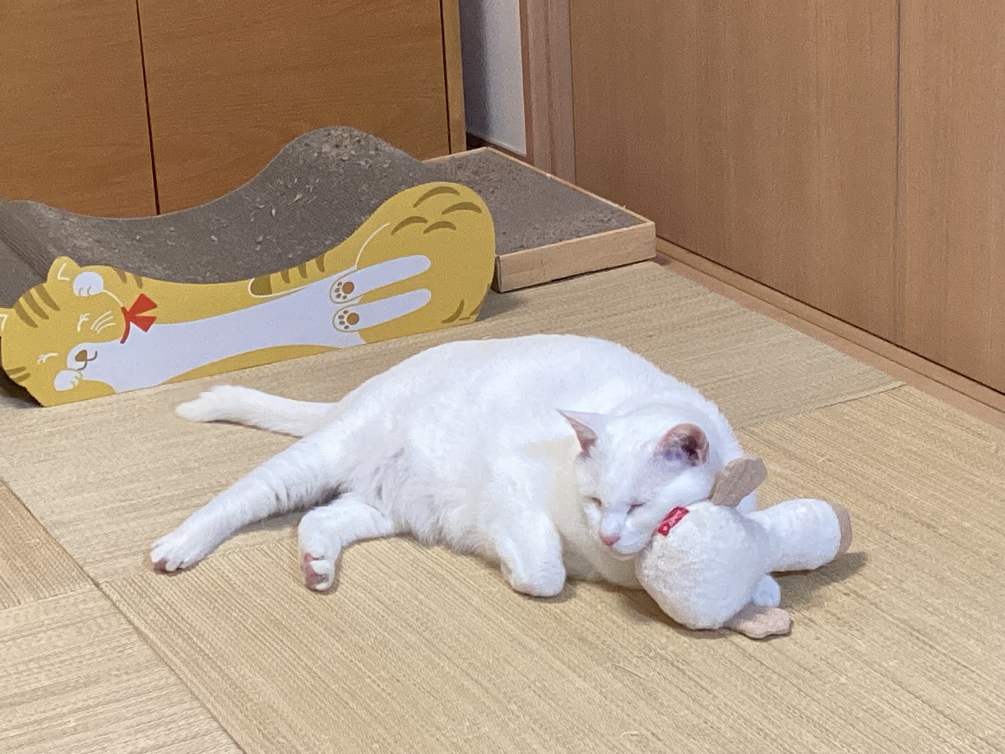 一緒に購入したけりマヨで遊び疲れてがーこちゃんと寝るのが日課になってます。フカフカして気持ち良さそうです。幸せそうな寝顔に家族みないやされてます。