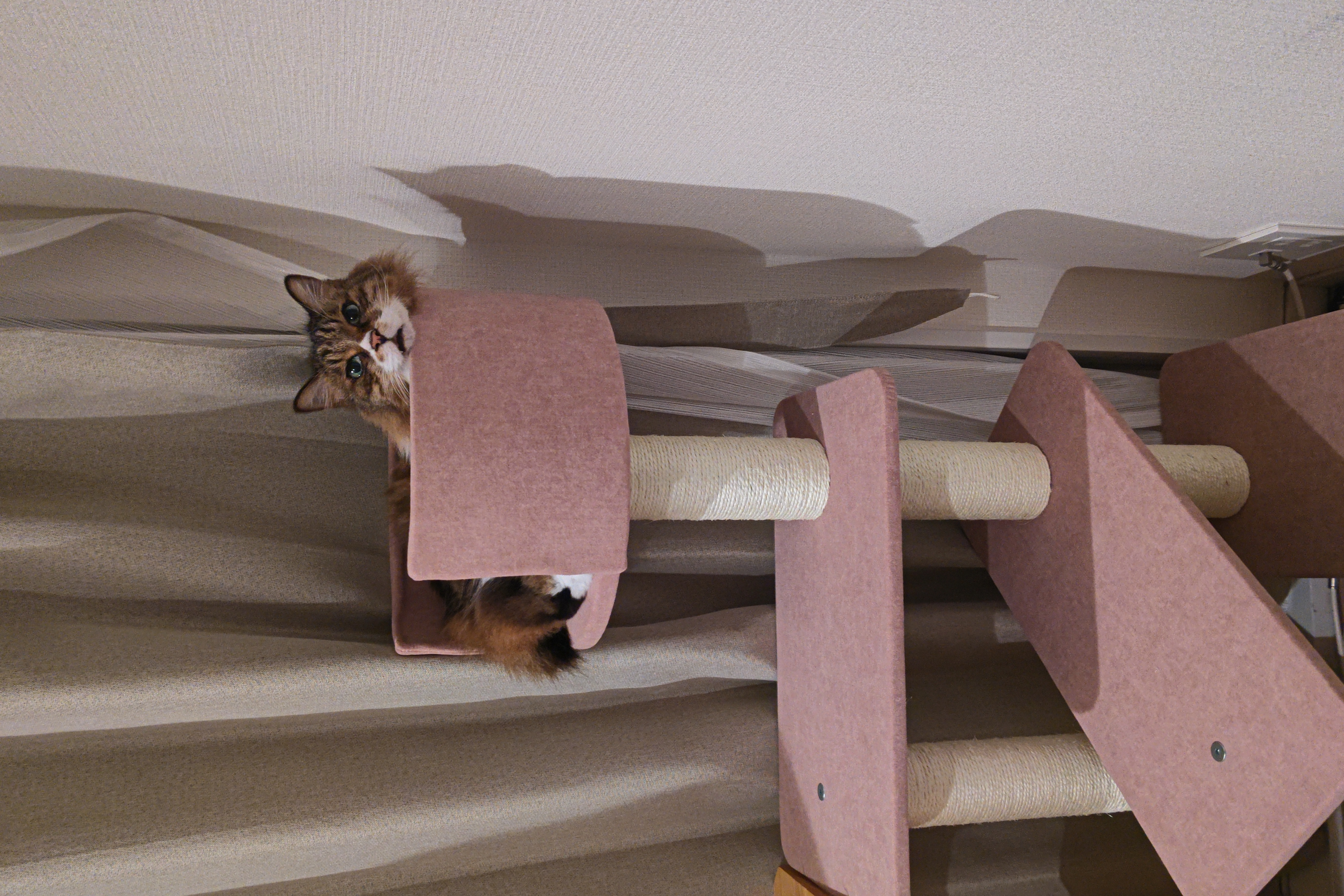 使っていたタワーが壊れてしまったので購入。 組み立ててすぐにカップに登り、昼寝を始めました。