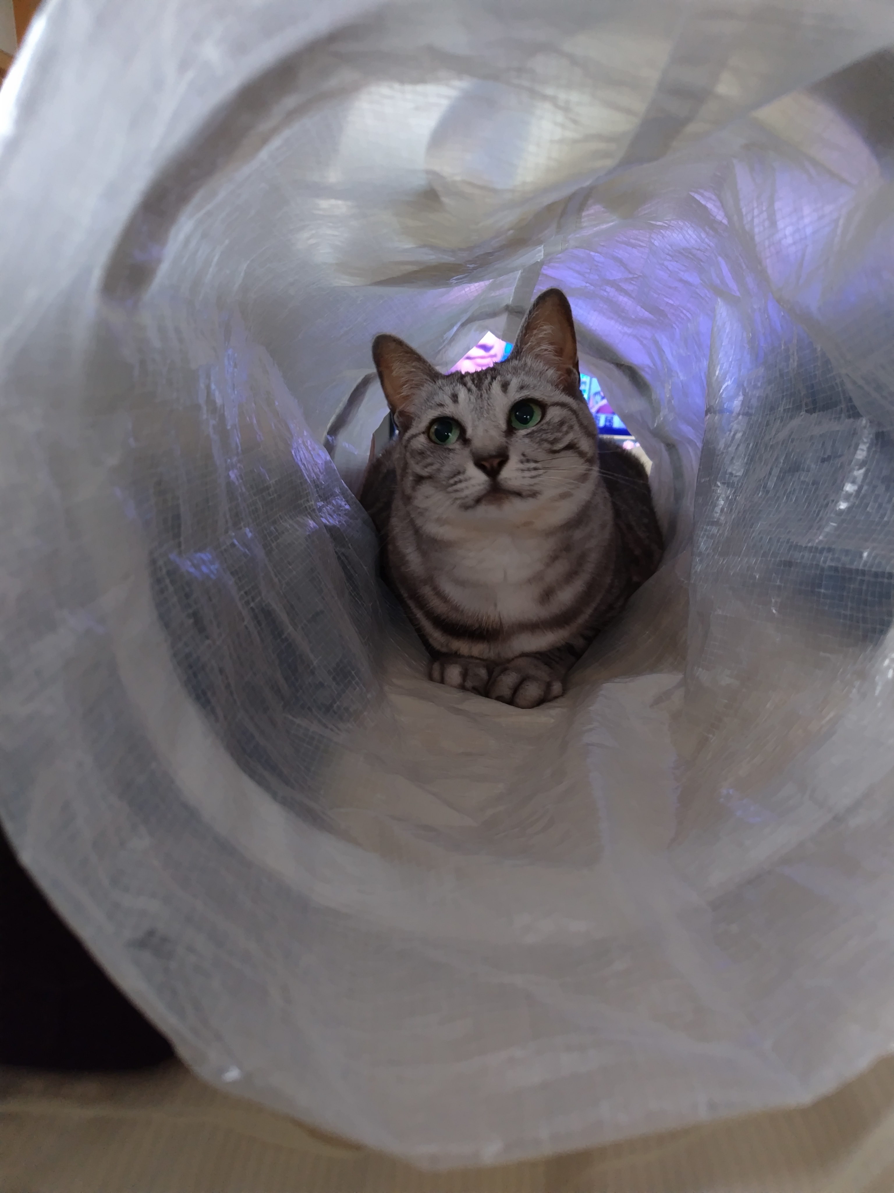 子猫の時は好きだったトンネル遊びも、ポッチャリしてスムーズに駆け抜けれなくなったからは見向きもしなくなって…明らかに運動不足のまま6歳を迎えたナナ。ちょっとでも刺激になればと購入しました。まず派手なガシャガシャ音が気に入り、スッと通り抜けることができる口径の広さも嬉しくて、毎日「遊ぼう!」と誘うようになりました。自分が中に入って外で動くリボンやジャラシを追いかけるのが今のブームです。長さを調節できるのも良いです。