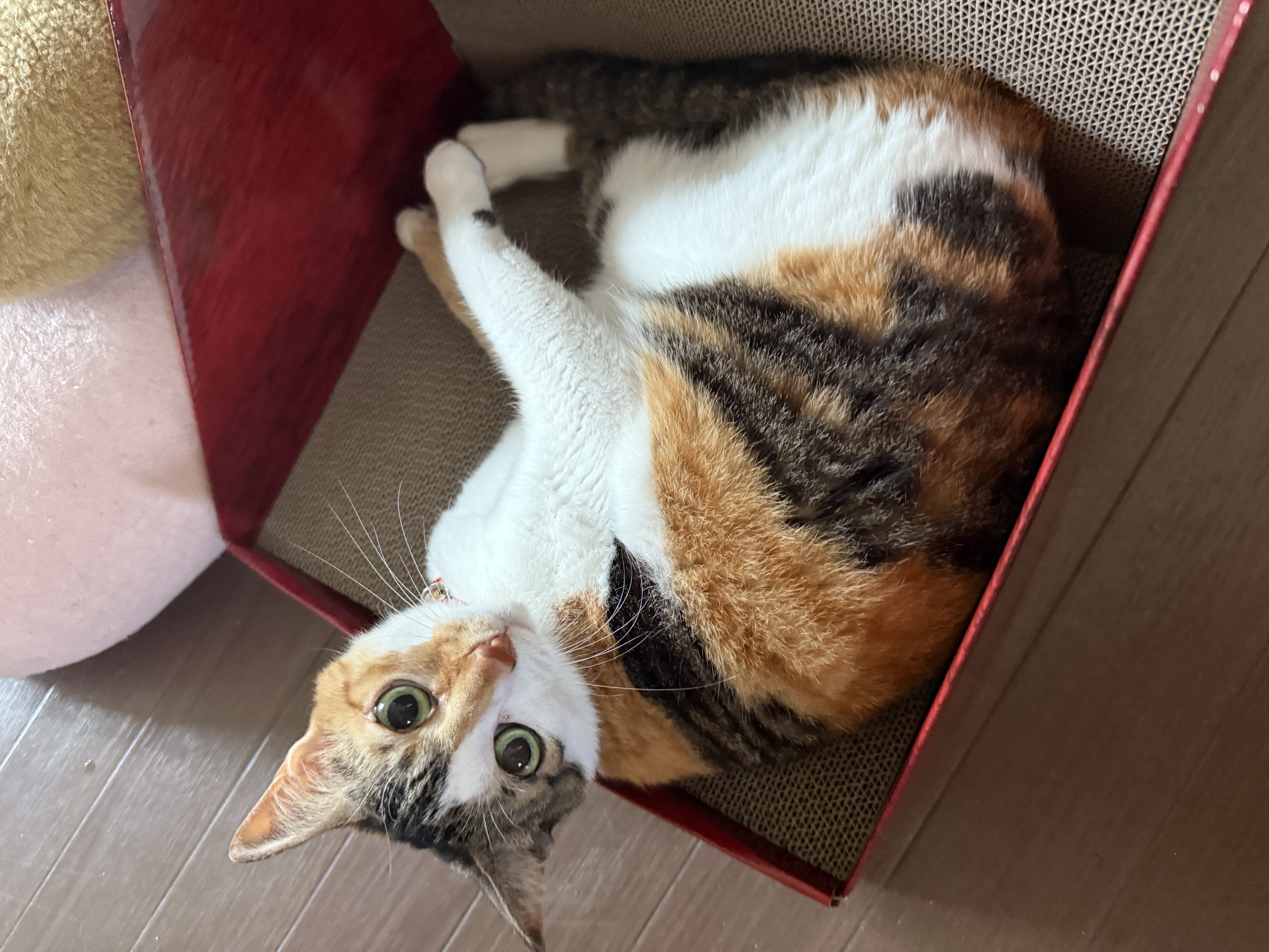 買ってきた日から壁で爪とぎしています。床の方でも爪とぎしたり、ちょこんと座ったりして気に入ってるみたいです。