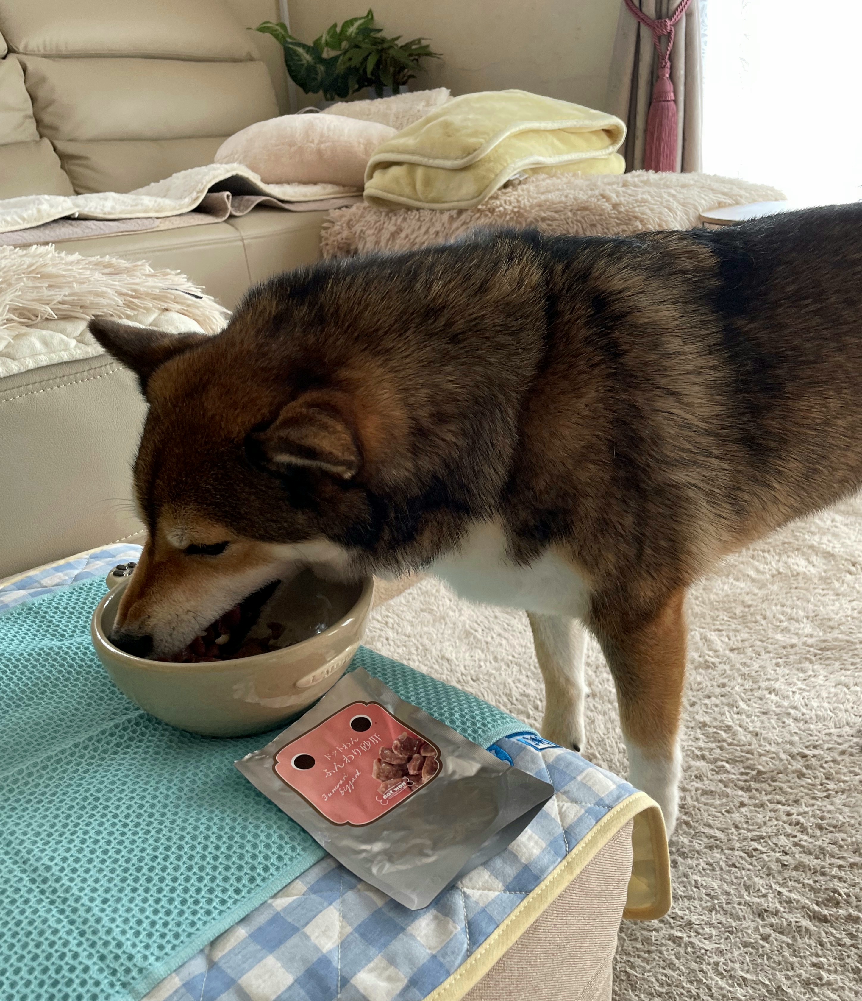 我が家の愛犬と姉の愛犬たち3匹で食べました。 我が家の愛犬に合わせたので、かなり小さく切って分けて食べました。 切っている間も、温めている間も落ち着きがなくウロウロ、キュンキュンと鳴いてました。それだけ楽しみだったのだと思います。 姉の家の愛犬も最近はトッピングなしでも食べるようになったようですが、すごくおいしかったようでいつもよりも早く完食してました。
