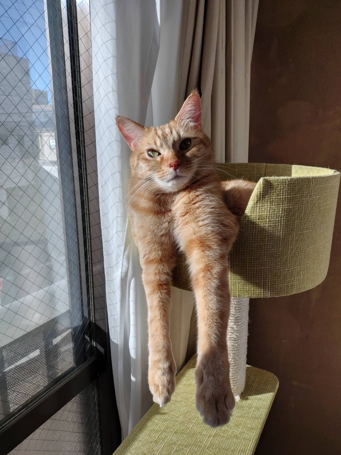 安定感があり、猫が飛び乗ってもあまりぐらつきは感じません。6.5キロもあるので、大きめのベッドが付いているものを探しました。すっぽりと寝られて気に入っている様子です。購入してよかったと思いました。 掲載した写真は両手が出ていますが、はみ出してるのではなく得意なポーズです。眠る時はきちんとしまって眠っています。