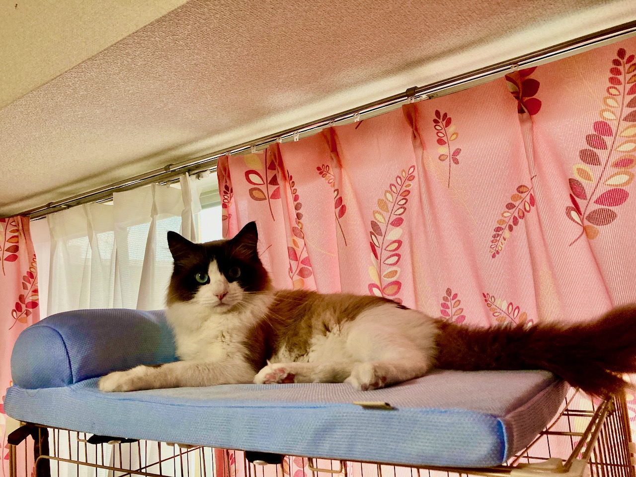 ラグドールの男の子と暮らしています。春夏用のベッドを探していたら運良くセール中でした。たまに意を決してケージに登ります。そうして天井でくつろぎます。なのでこういうベッドあったら喜ぶかなとおもってカタログで目にした時から気になっていました。体重は4.2~4.6をうろうろ。ご飯わっくわくで一生懸命背伸びすると70cm台所にぎり顔が届きます。取り付けて1日目。気にする。気にする。すごい気にする。2日目じっとこっちを見てのっけてくれと訴える。そのままゴロンゴロン、すりんすりんして大変気に入りました。ケージが三段あるため、流石に毎日気楽には登れないのでケージ用ステップを追加で購入することにしました。春夏の暑い季節。心地よいおねんねタイムを満喫してくれたら嬉しいです。