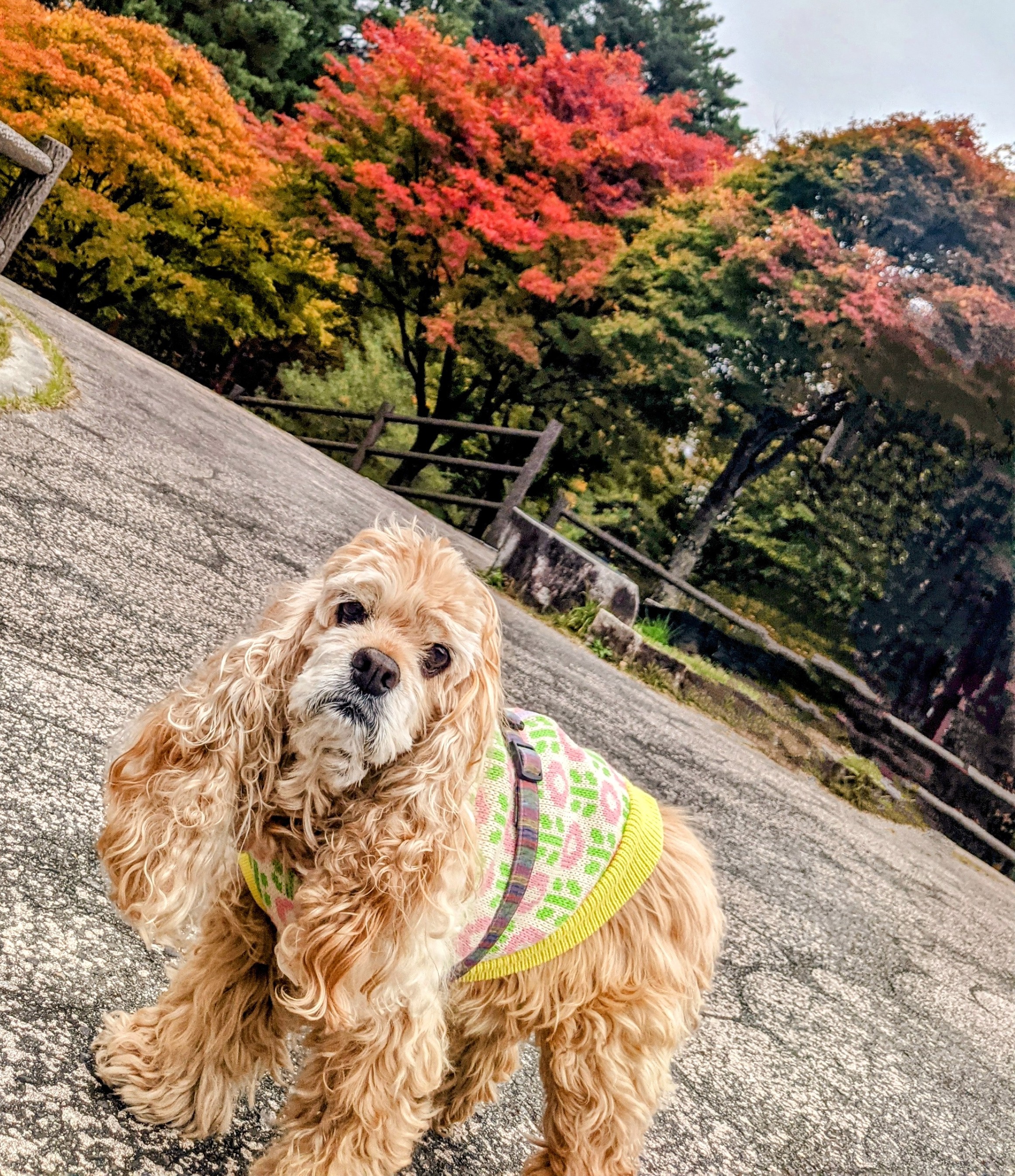 とてもかわいいです。背中に大きいくまさんの顔がありますが、派手すぎません。色味も秋らしく、うちの子の毛の色ととても合います。