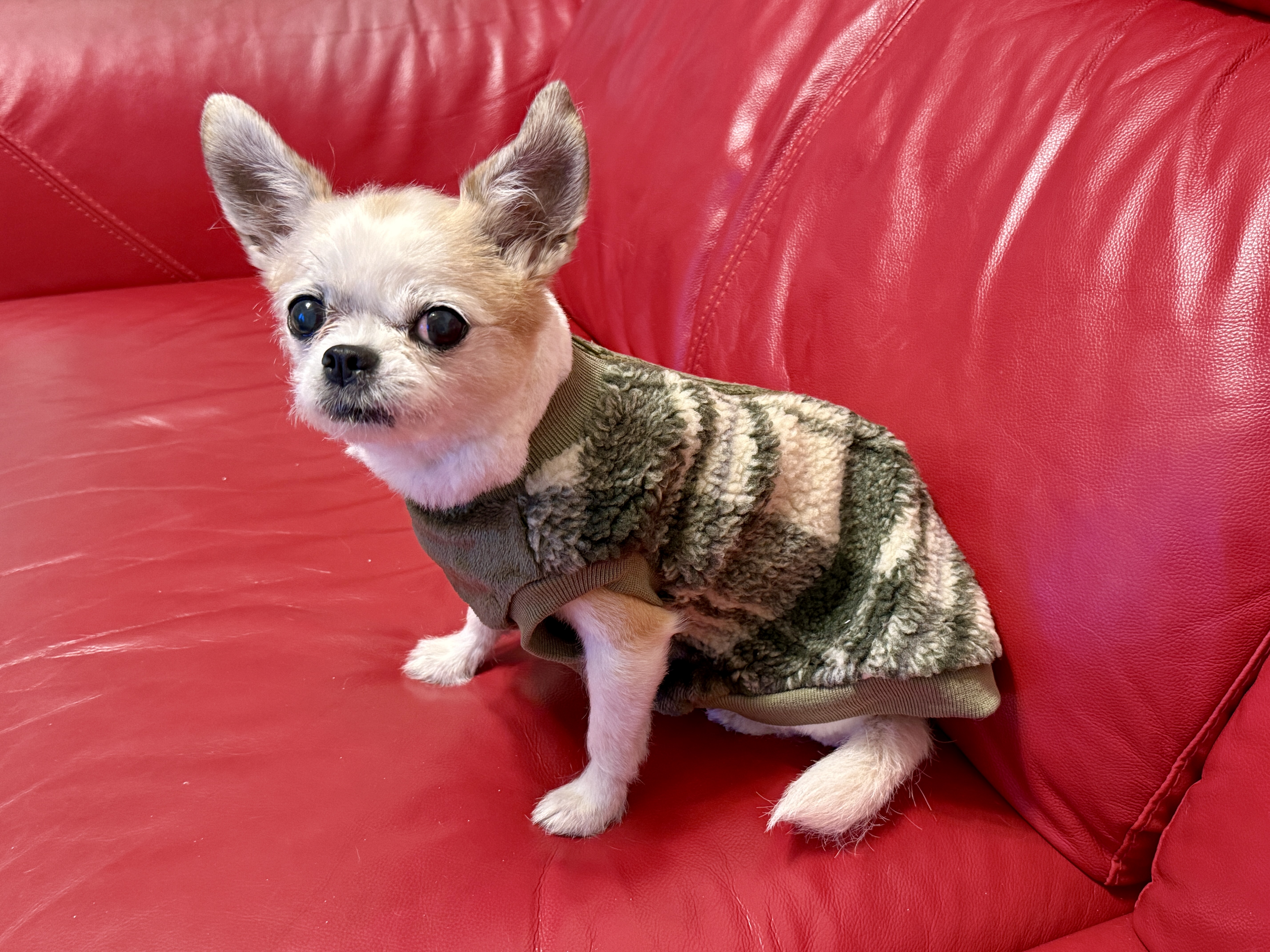 4号で少し大きいけど、もっと寒くなると下にスキンスーツみたいなのを着るので冬物はこれで全然いいです。フワフワで軽いので着せる方も着る方も良い感じです。ただ、うちの犬は毛を短くしているので、刺繍のアップリケ部分の裏面が固くガビガビしてるので気になるようでした。