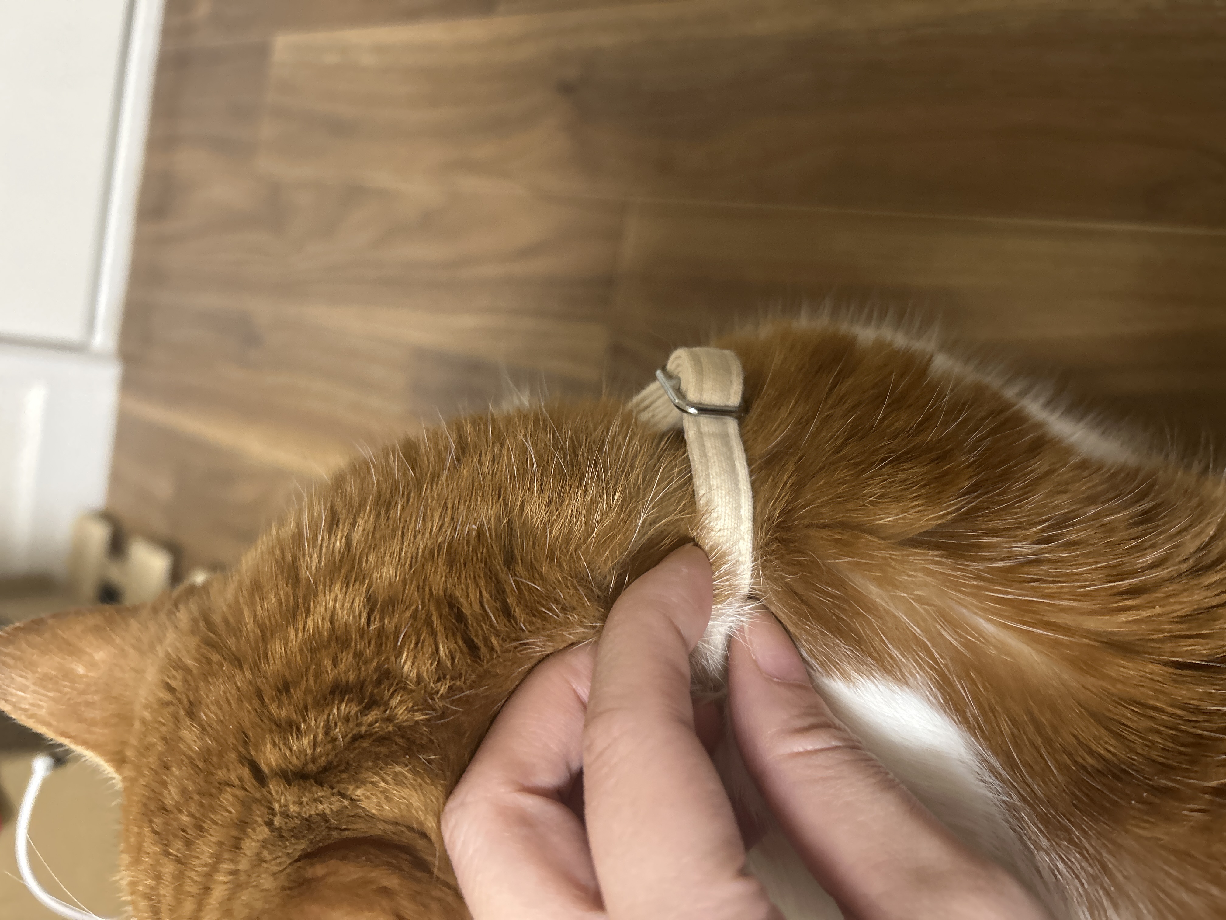 全体な感想 柔らかい作り・色で良い感じです。 愛猫の様子 軽いのか違和感なく着用しています。鈴が無いのが良い! 残念点 厚みがある作りのためか、サイズ調整する金具の部分に厚みができてしまうのが見た目的に少し気になりました。(ペラペラな作りよりはいいので許容範囲です。)