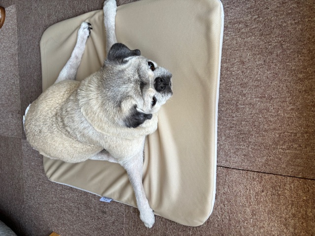 盲導犬を引退したヒースは元々両ひじに大きなタコができていました。左前肢に亀の手のような腫瘍ができ、左後肢横に小さなタコがあり、現在一日中同じ位置で左側を下にして横向き寝(左側臥位)しています。まだ完全な寝たきりではありませんが、一日の23時間半は寝ていますので、褥瘡予防にとても感触も良くカバーが外せて洗濯できるのは助かります。