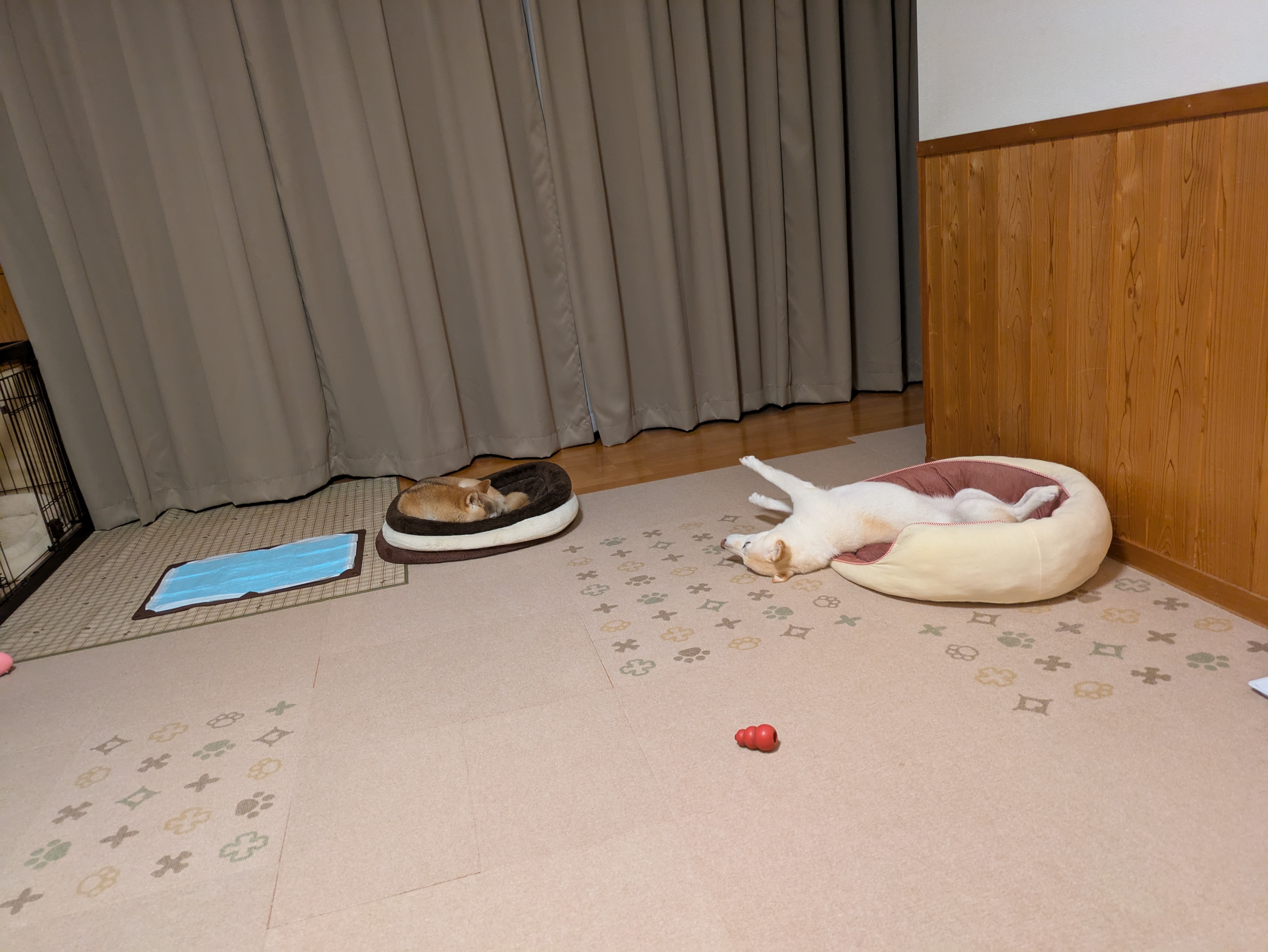 暑くなって散歩の時間が短くなってましたが、ピタッと吸着タイルマットを敷くと部屋の中で楽しそうに走り回って疲れてお昼寝しています。
