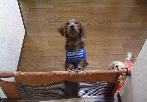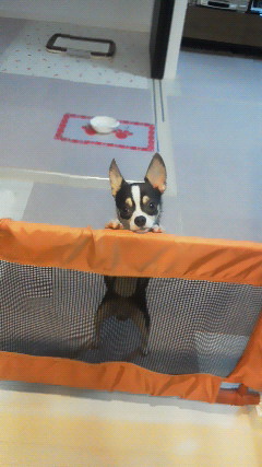 階段の前に付けました。 これで、階段に上る事なく安心して過ごせます。 跨いで階段に上れるので、高さもちょうど良いです。