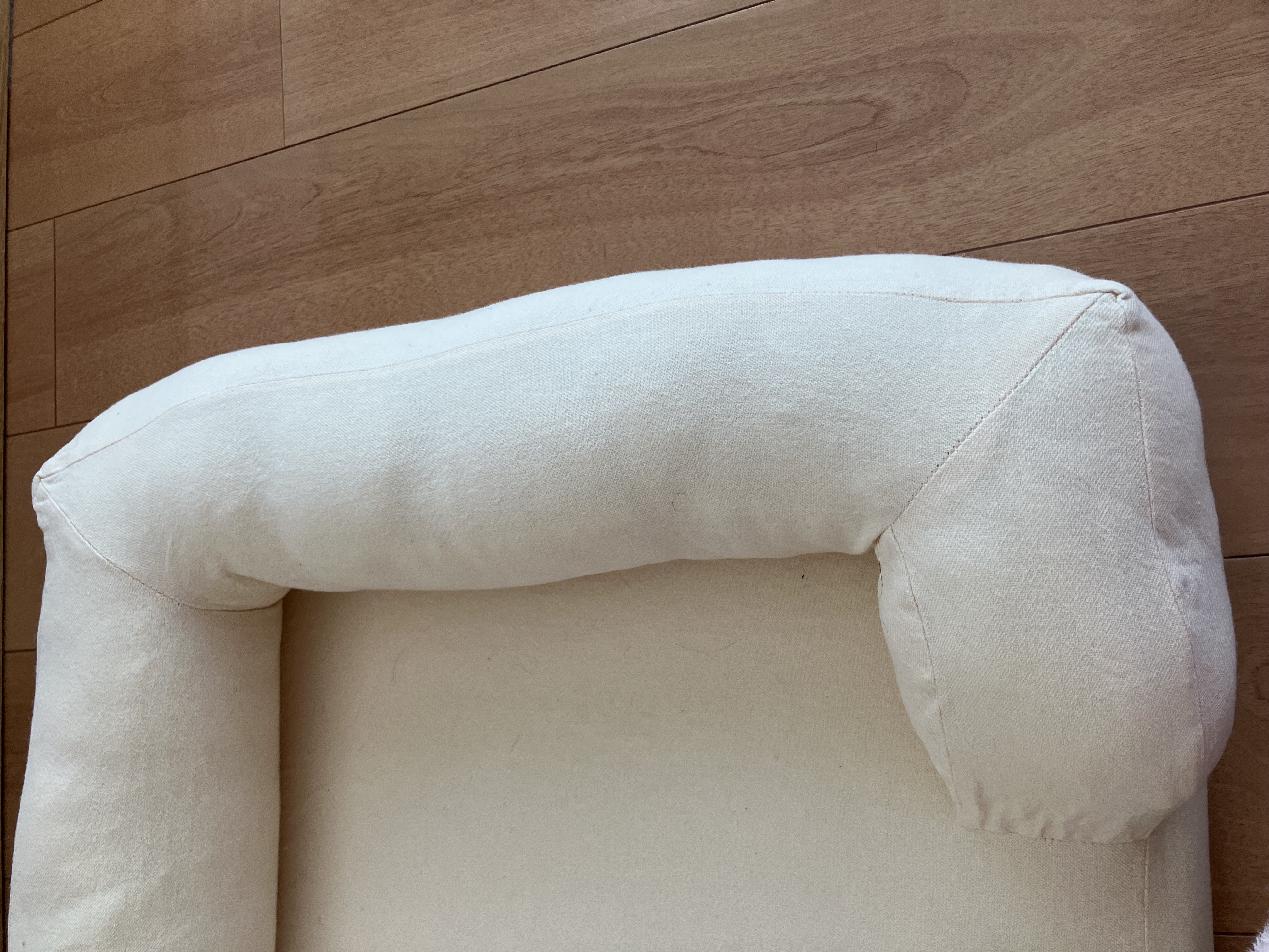同じ形のベッド「抜け毛が払いやすいスクエアソファー」のベッドカバーはポリエステルで縮まずカバー交換が簡単でした。ただポリエステルなので犬が滑ってしまい使用中止しました。