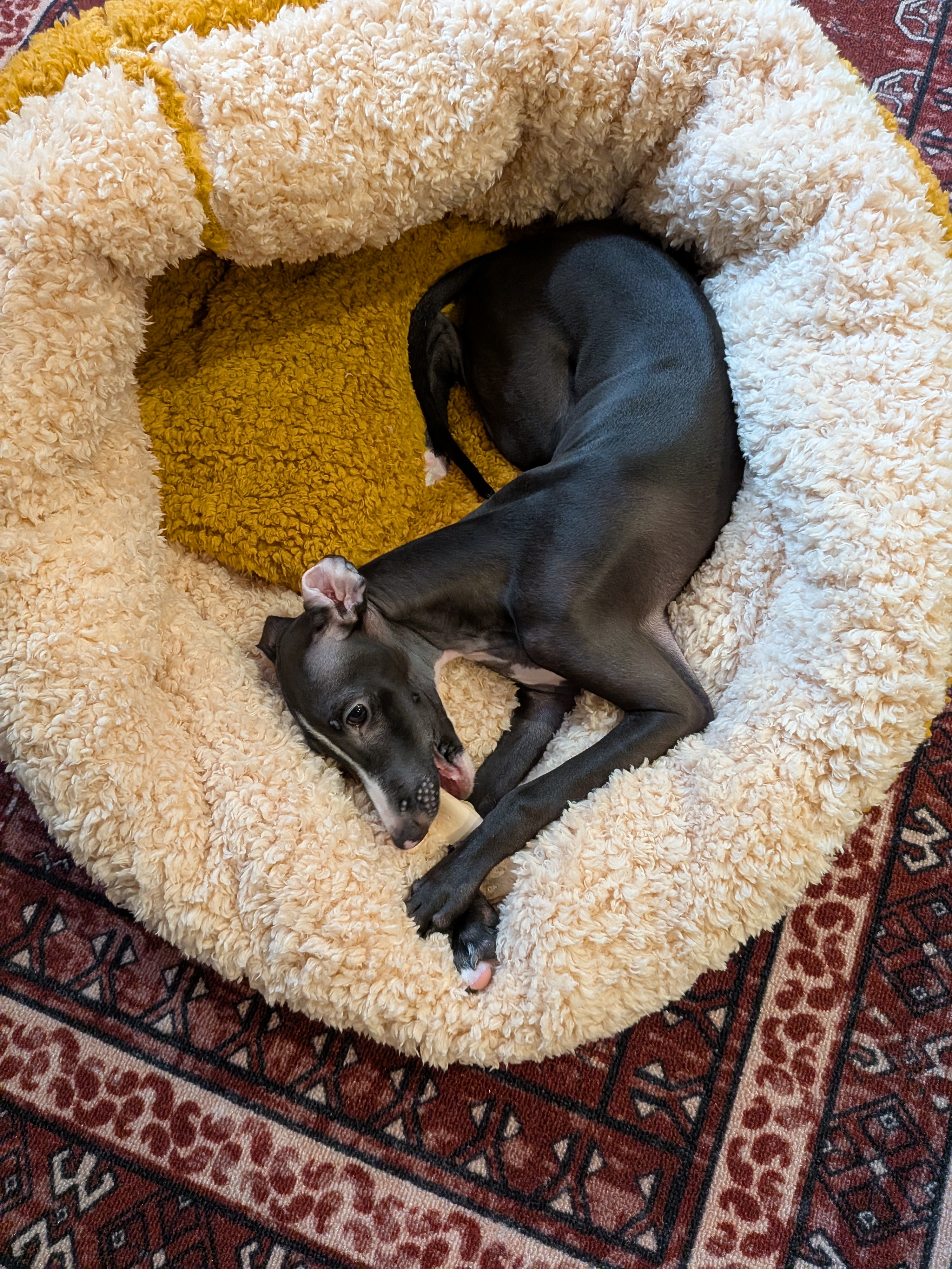 スムースコートチワワなので寒がりで、ぬくぬくのベッドに大満足のご様子。