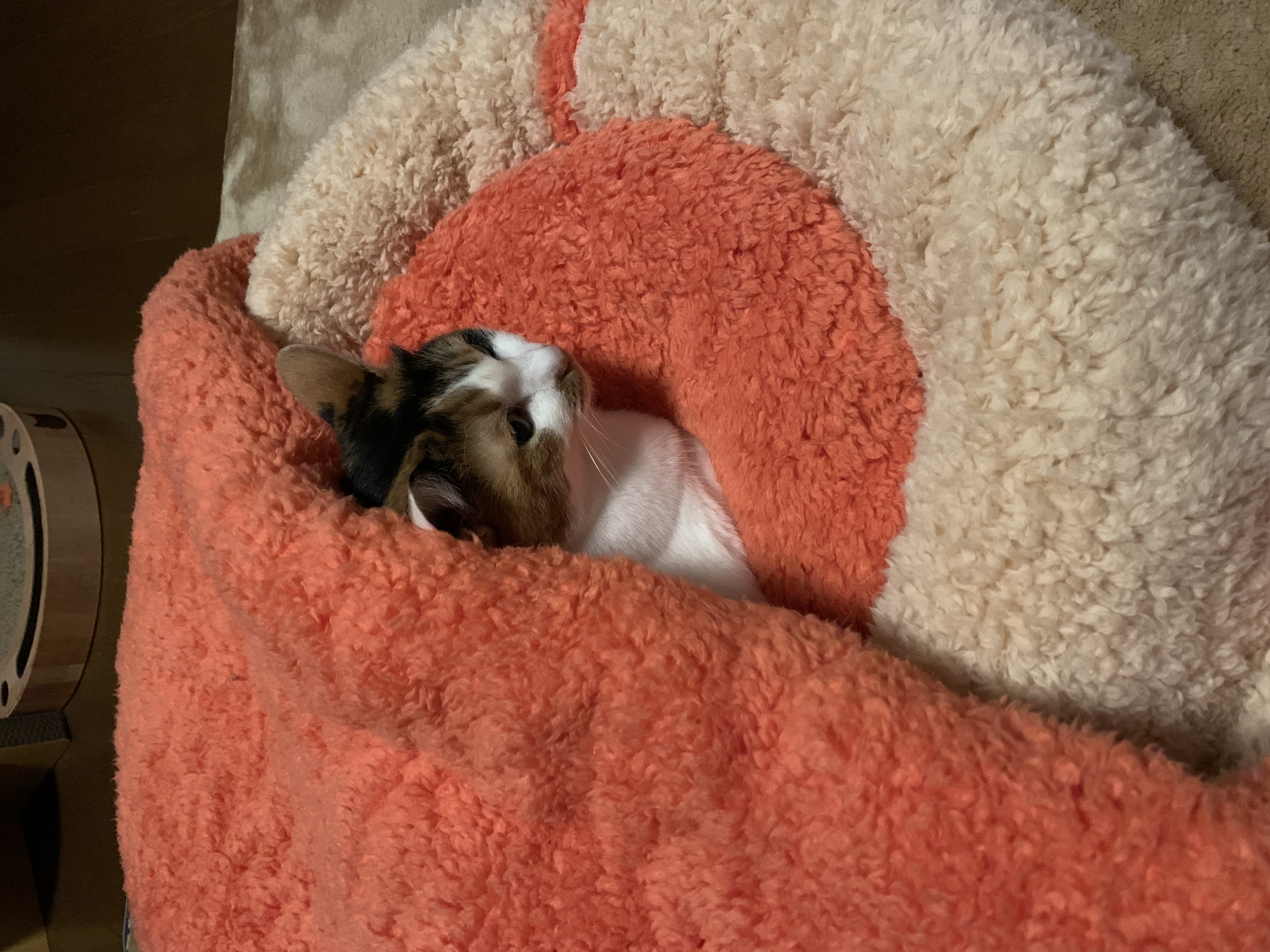 三毛猫ミイ子が気にいるか心配でしたが、数日はスルーしていましたが、ついに入りましたww1日に1回は入っています。気に入って良かったです。黒猫ノワローの方は、初日から使っています。こちらは上から乗る使い方!Sでは少し大きすぎること、フワフワの毛がよく抜けるので☆マイナス1にしました。