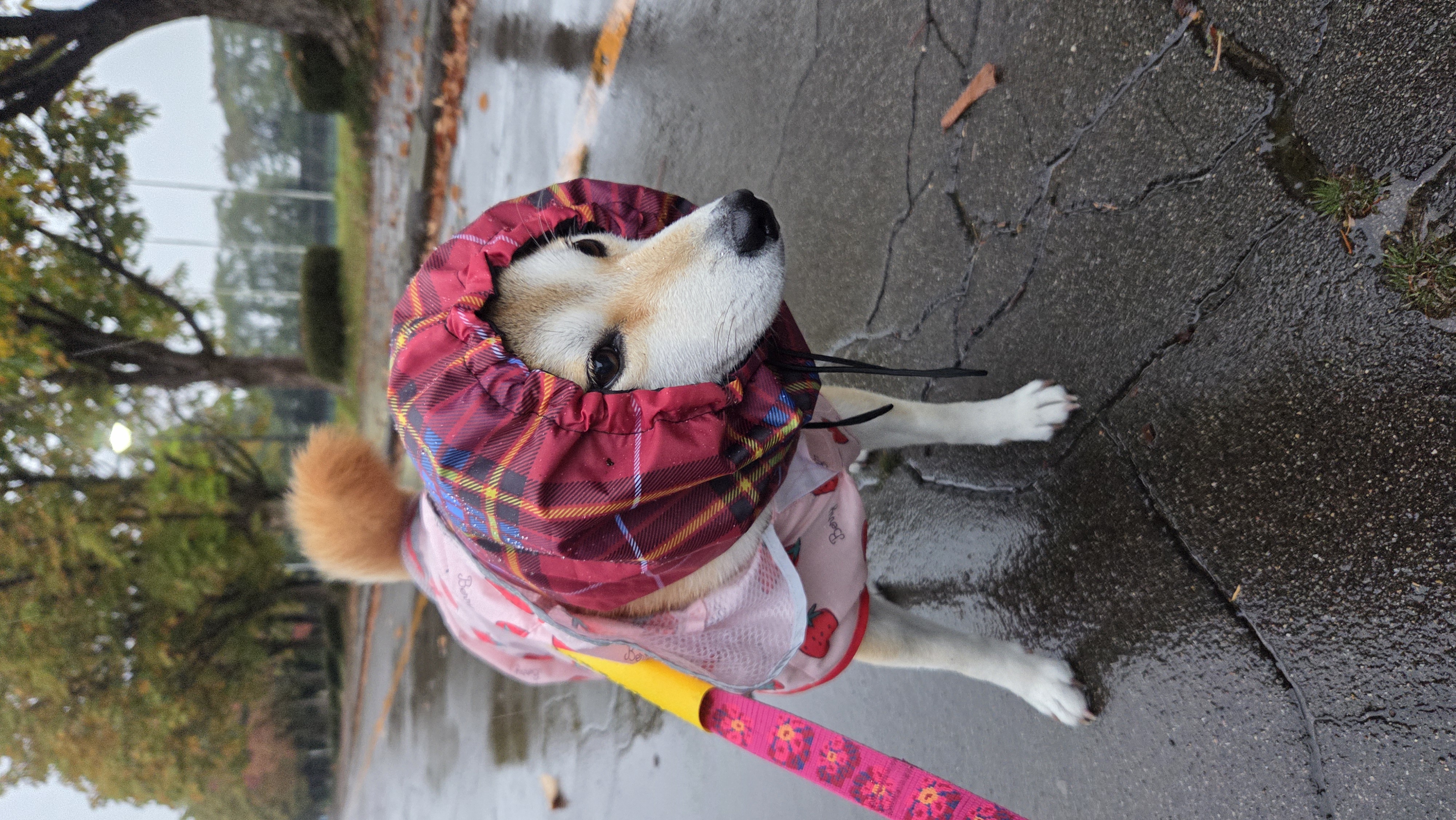 耳が隠れるので嫌がるかなぁと思っていたのですが、全くそんなことはなくちゃんと付けたままお散歩してくれます。頭に雨が当たらなくてすごく良いです!