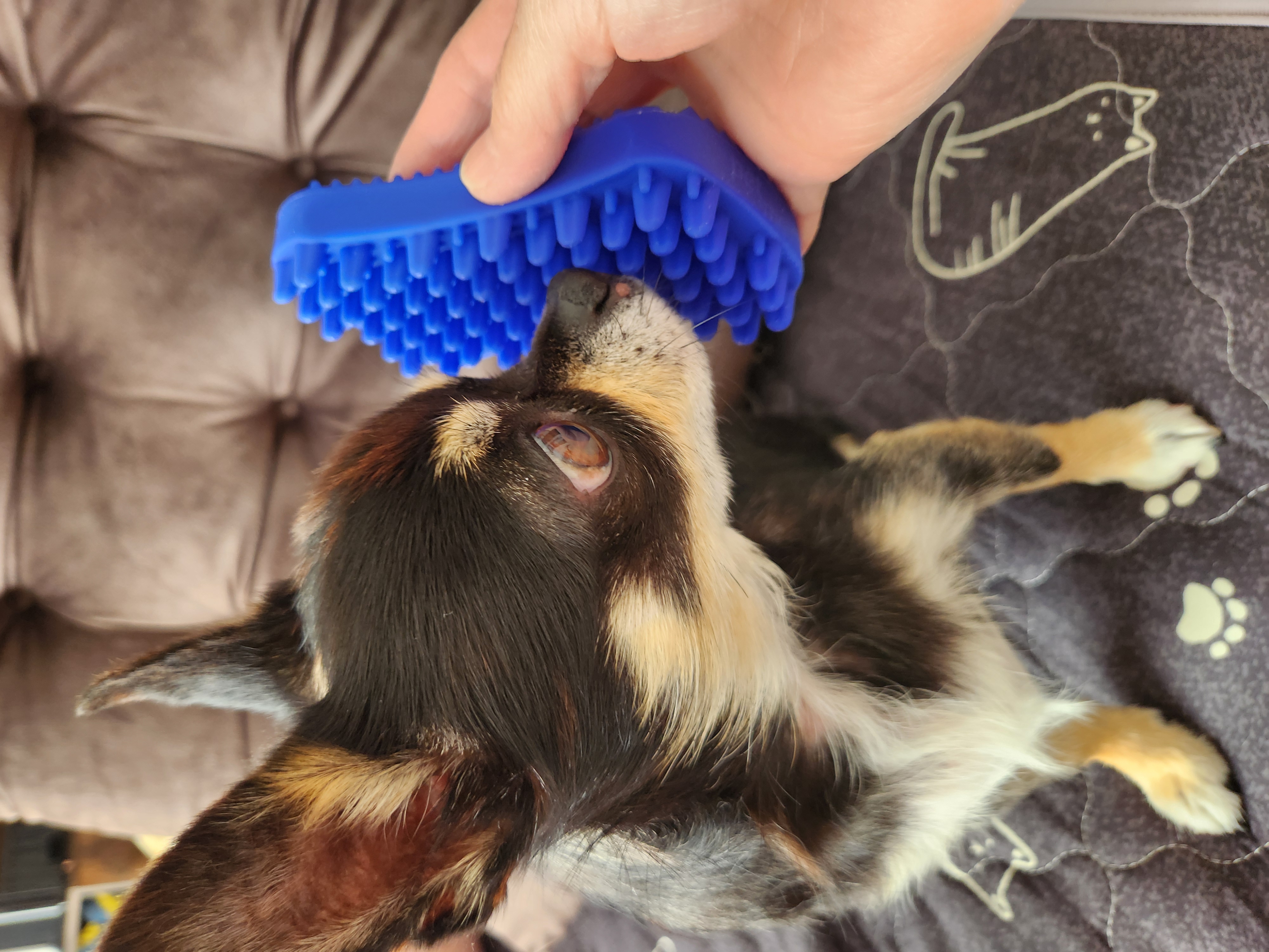 肌が弱くブラシによってはかぶれてしまう事もあるのですが、このシリコンブラシは柔らかく愛犬に負担なく抜け毛もフケも取れて丸洗い出来るし、マッサージ効果もありブラッシングの途中でリラックスして寝てしまいます。購入してよかったなと思います。