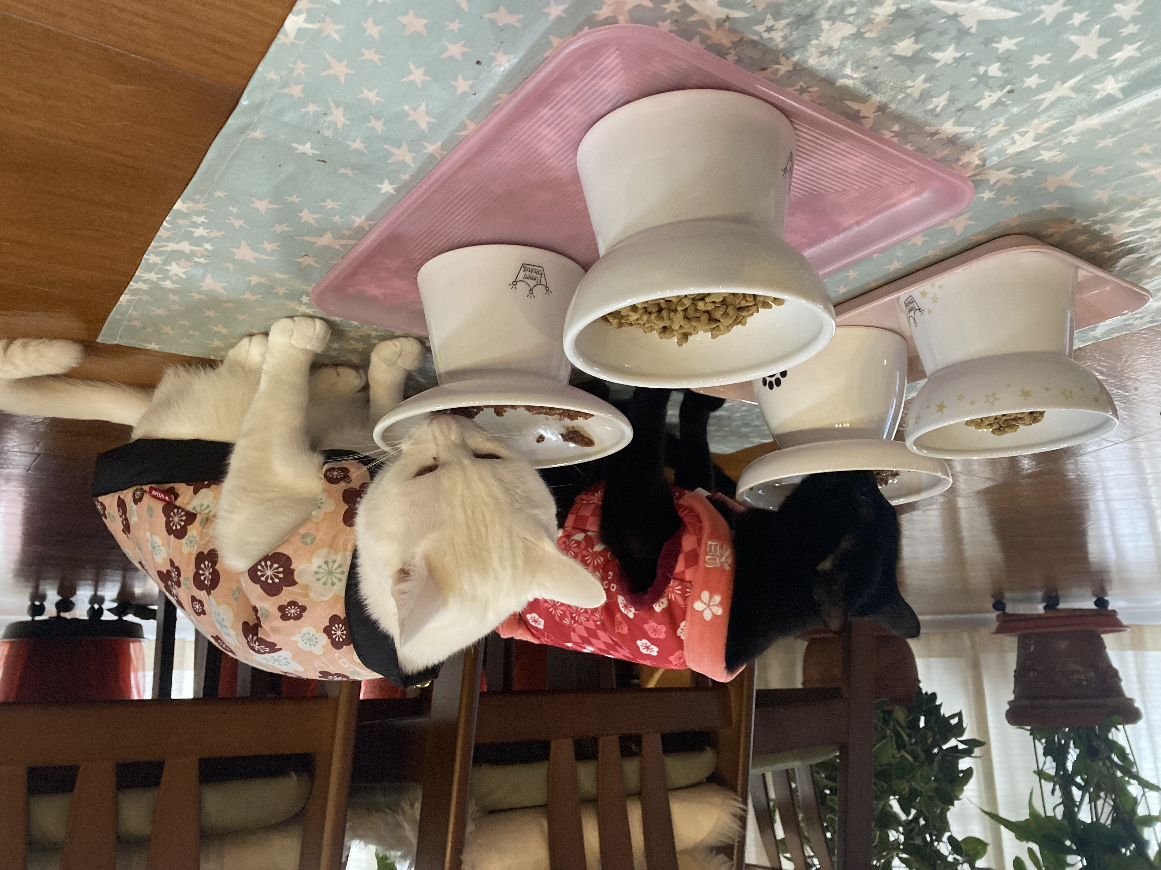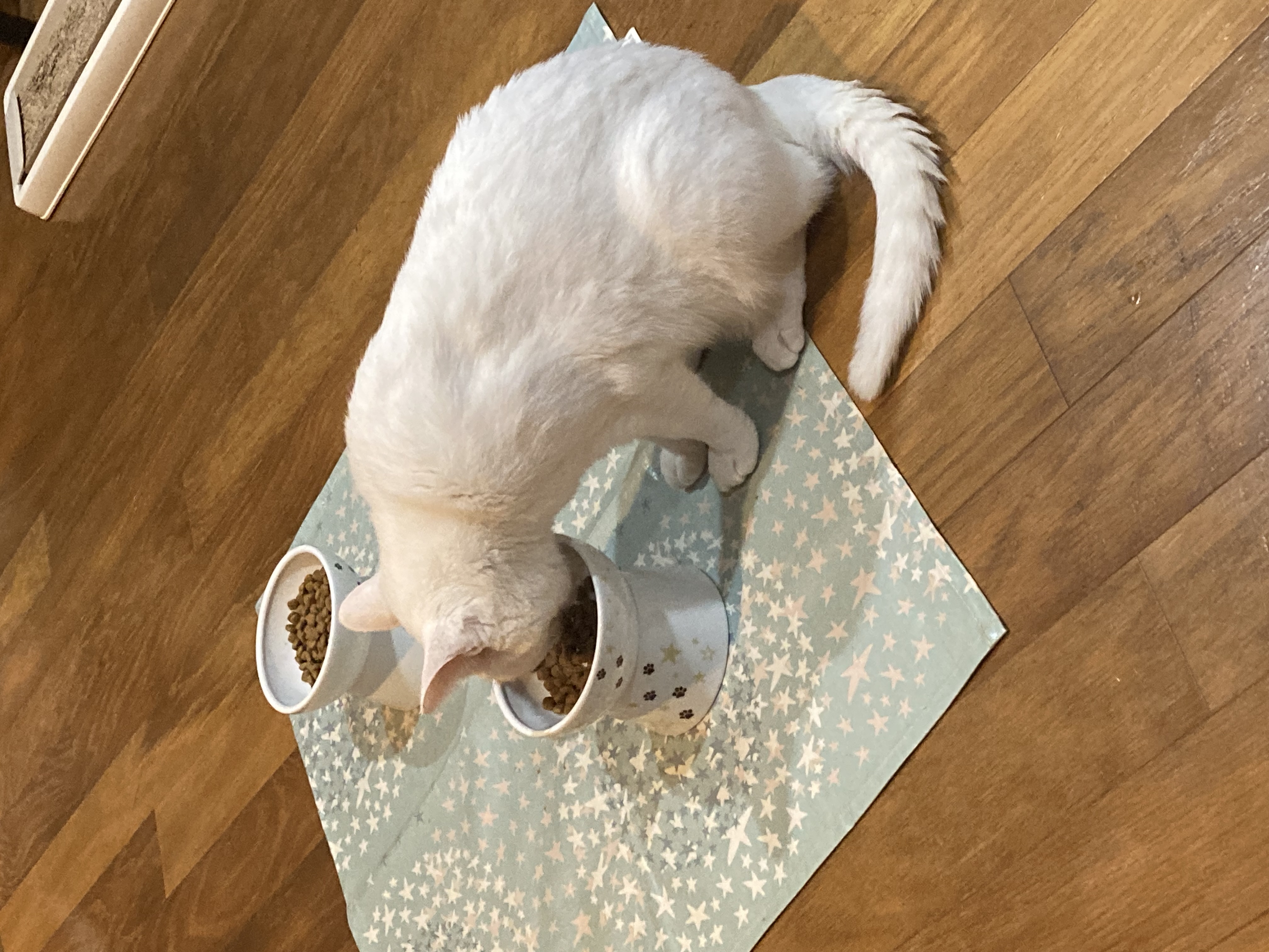 前から気になっていましたが、猫たちもシニアになってきたので、思い切って脚付タイプの食器に変えてみました。 まずはフードボウルを試しに買ってみたのですが、食べやすそうにしているのでLサイズも追加購入しました。