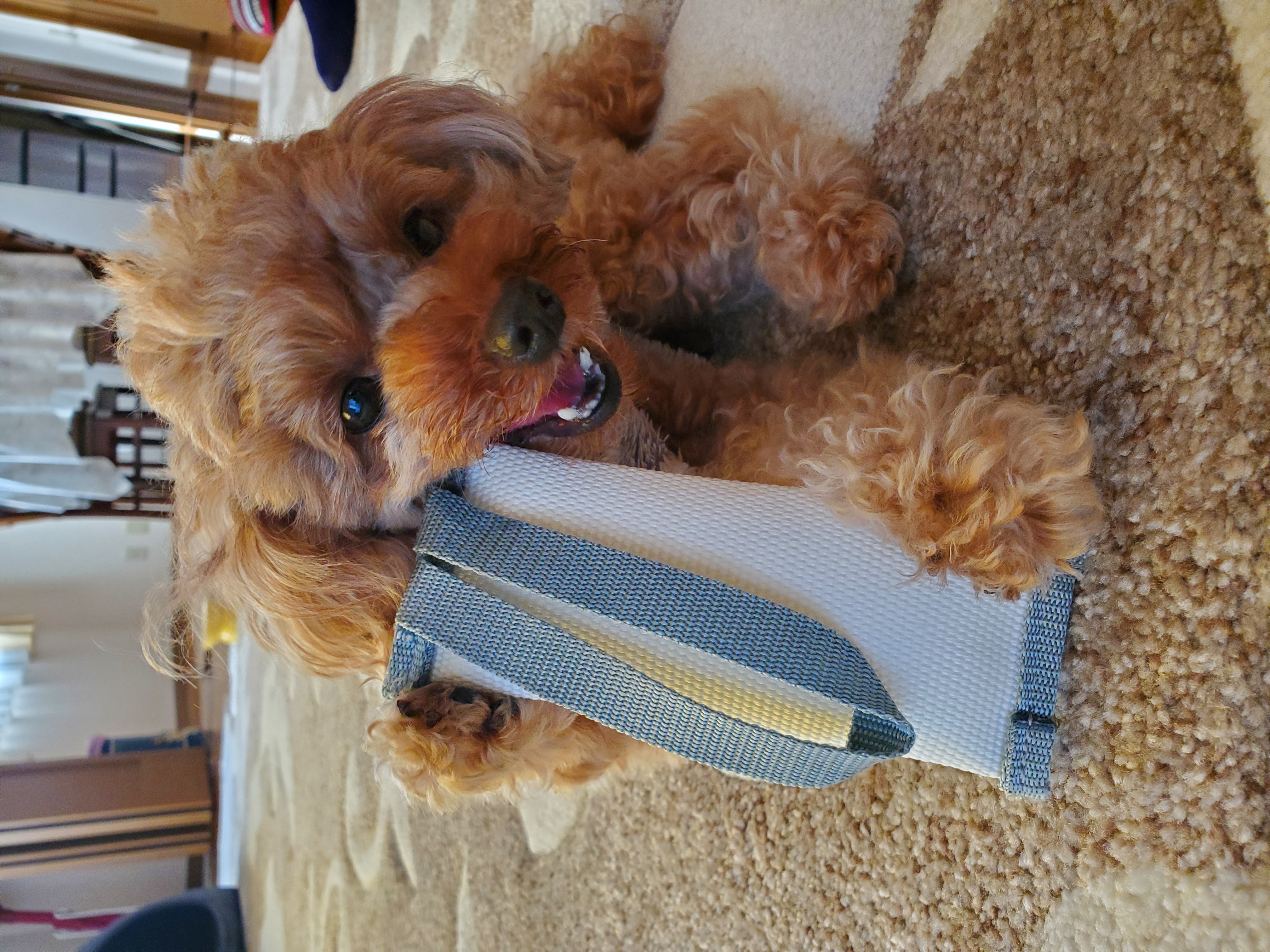 持ち手や縫い目のところを噛もうとして、肝心の消防ホースのところは今のところ、興味をあまりしめさず、少し残念です。縫い目のところばかり気になるようで、そこのところを破壊するのは時間の問題のような気がするので、そこもホースの素材でできていればもっと良かったと思います。