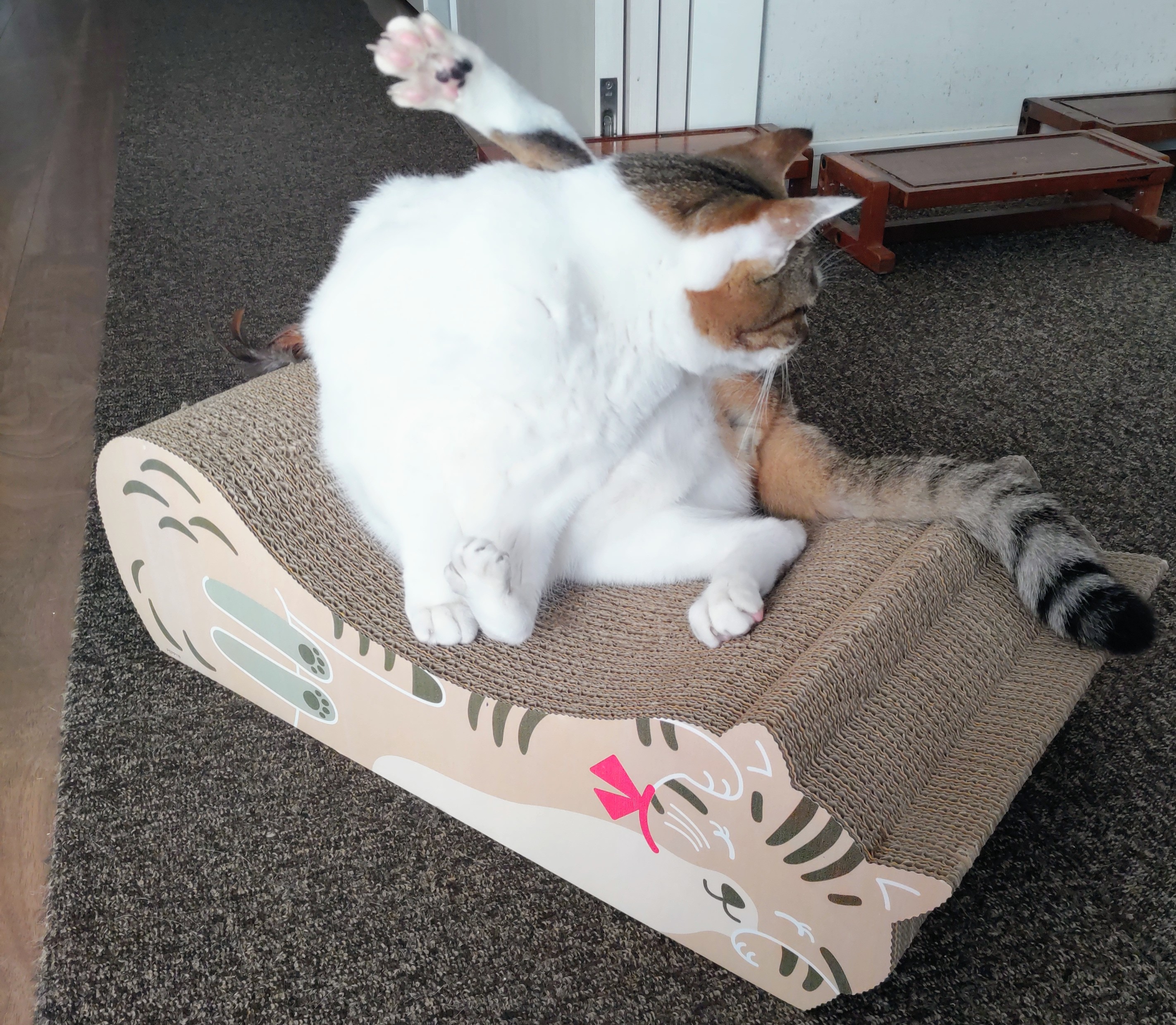しっかりとした重みがあるので、猫が飛んだり跳ねたりしてもひっくり返ったりしないので、とても安定感があります。 段ボールが密にギュッと詰まってるので、たくさん爪研ぎしてもへたりにくそうです。 商品名の通り、ごろんと寝たり、リラックスして猫たち使っています。
