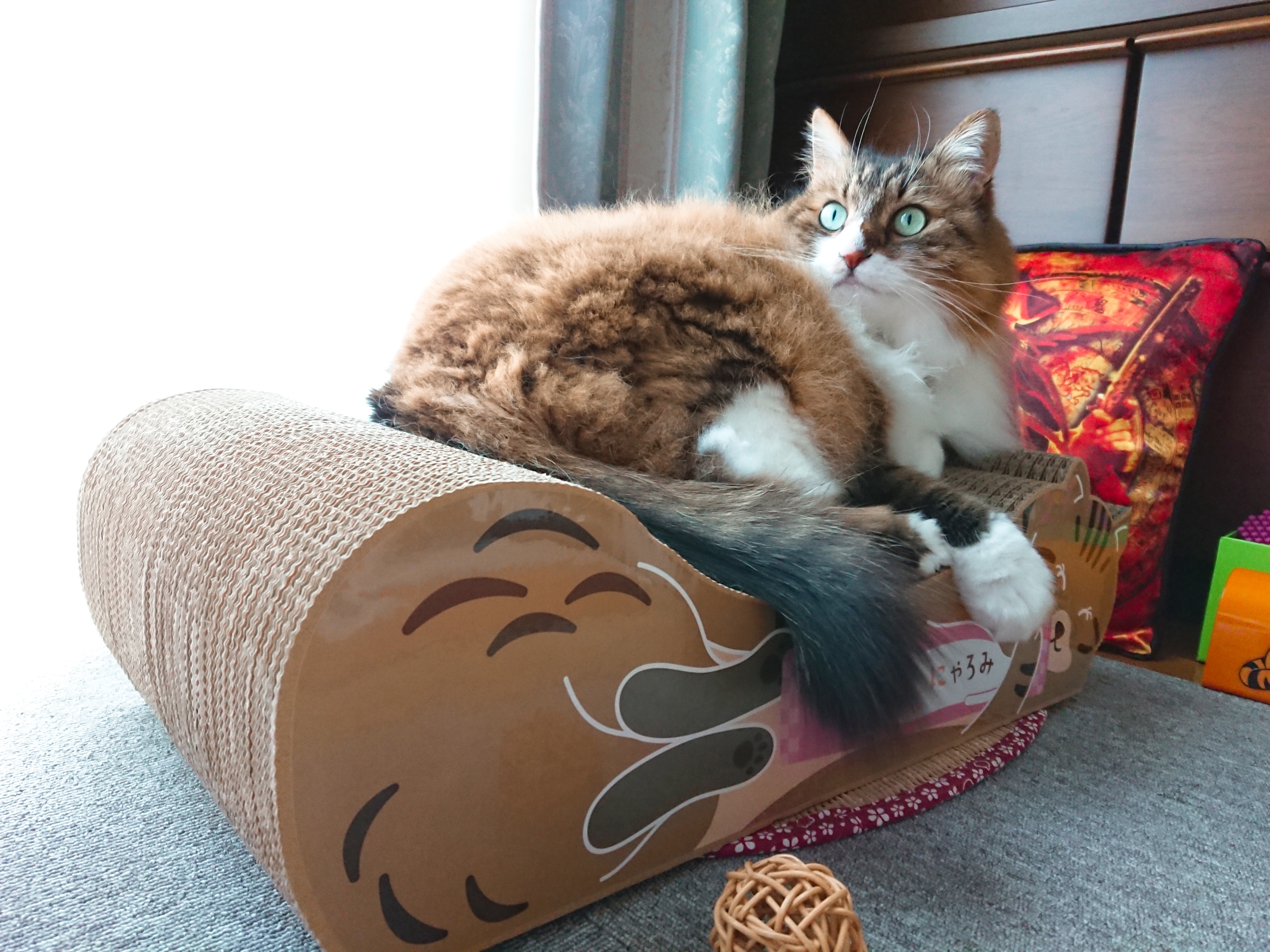 夏は段ボールの爪とぎで夜寝ることか多いので、新しく新調しました。 届いてから一週間くらいは見向きもしてくれなかったので焦りましたが、今はかなりお気に入りの様子で一安心です。 大きめの猫なのですが、サイズも、ぴったりです!