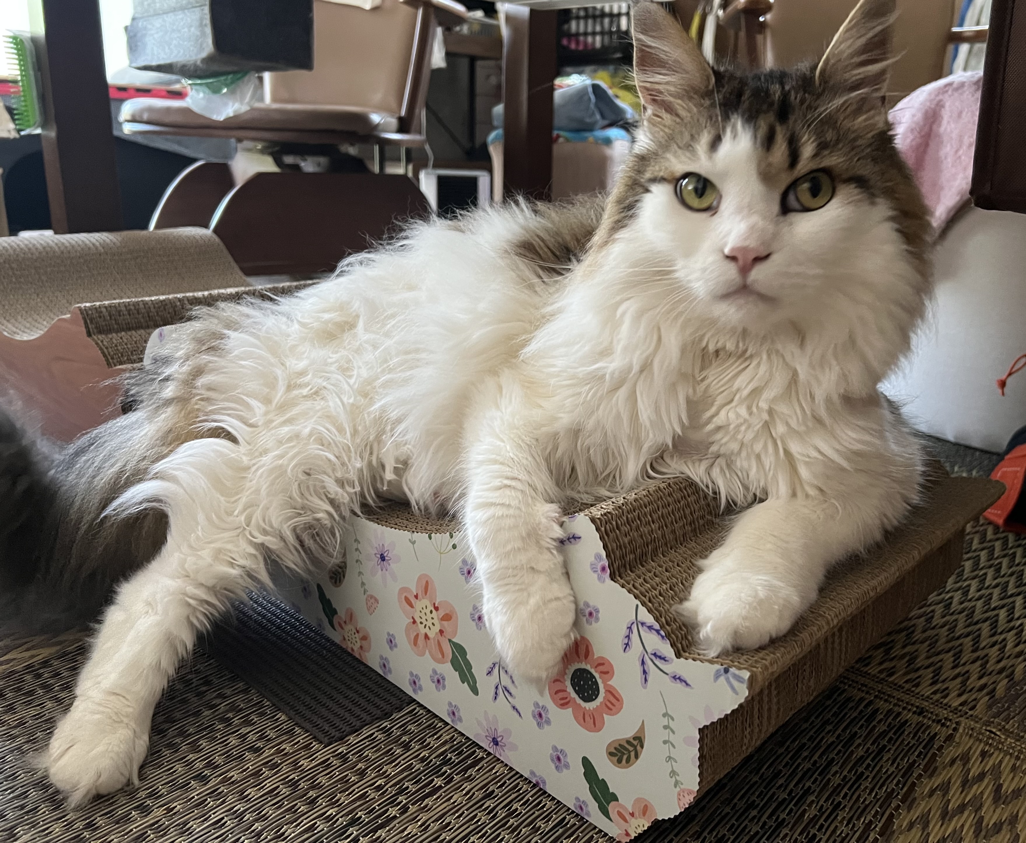 箱から取り出し置くのも待てないぐらいの勢いで爪研ぎを! その後 毛繕いをしておやつのおねだりをしていたのも忘れてくつろいでました。以前購入した時よりも随分と大猫さんになりましたがピッタリ収まっているようで安心しました。これほど利用してくれると買ってよかったとつくづく思います。(只今 6.5k )