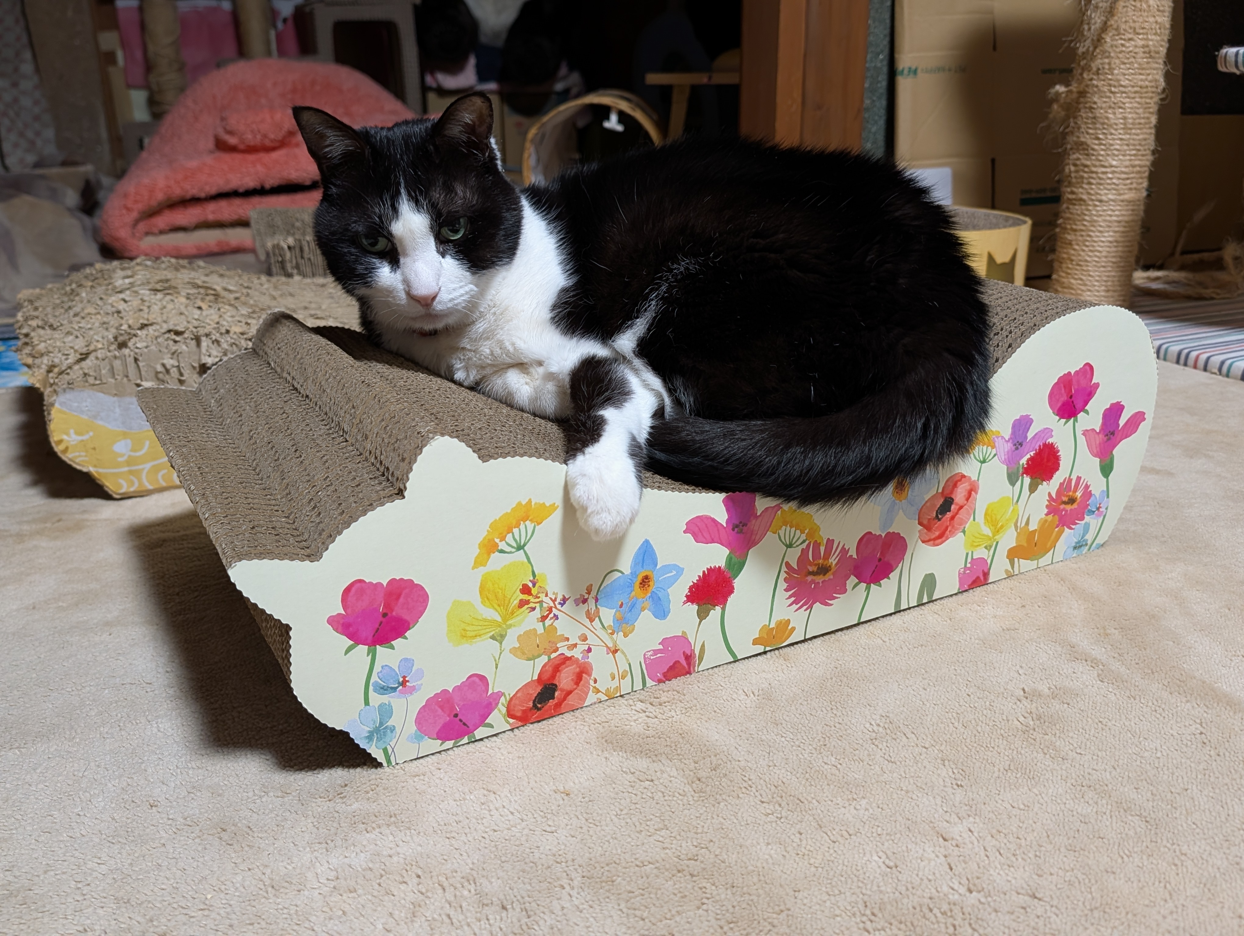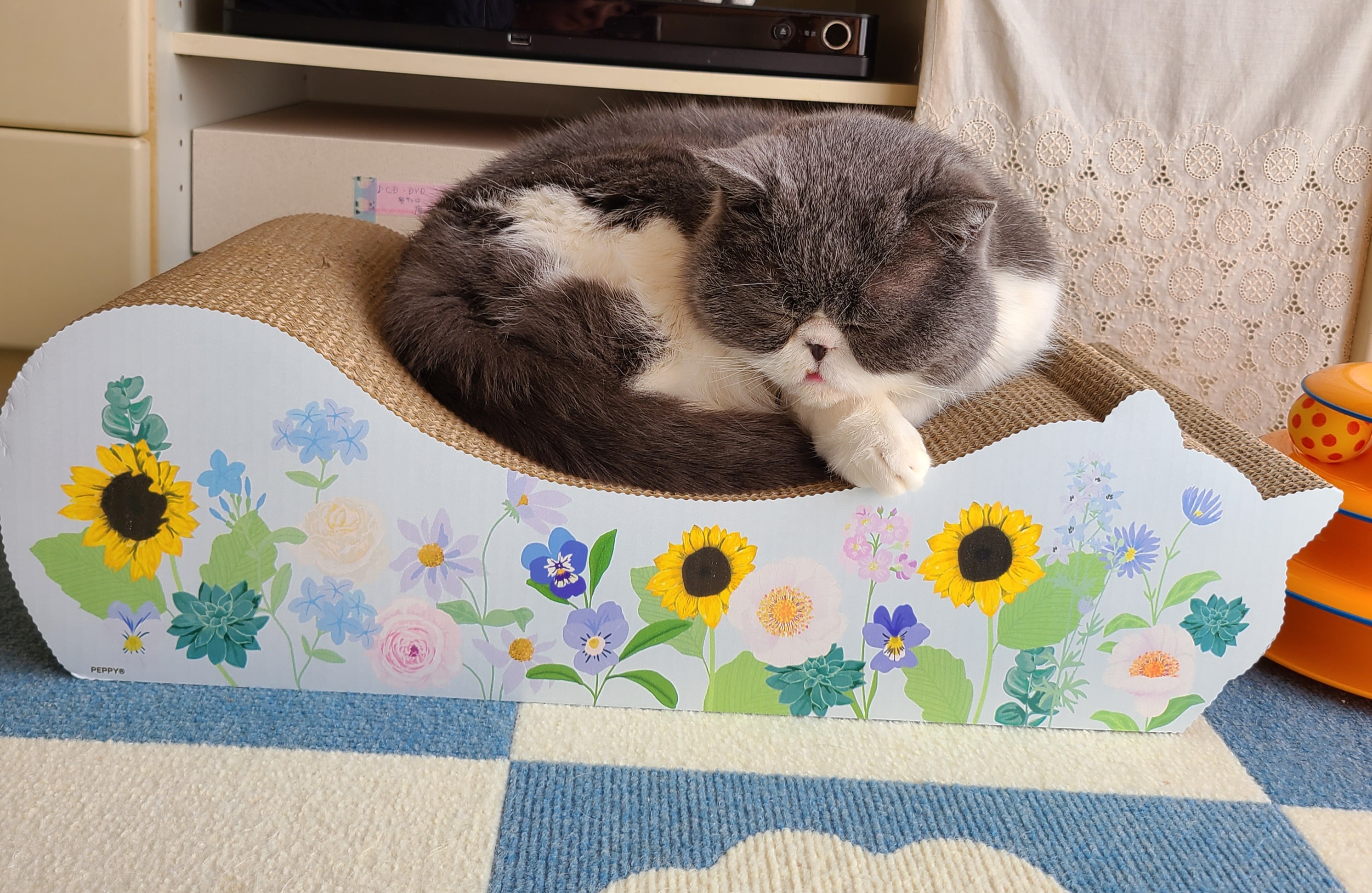 箱から出したとたんに、上に乗って背中を伸ばして爪を研いだり、顔をスリスリしてくつろいでいました。 多頭飼いですが、どの猫も気に入って使っています。 花柄が可愛くて、部屋に花が咲いているようで明るくなった感じがします。