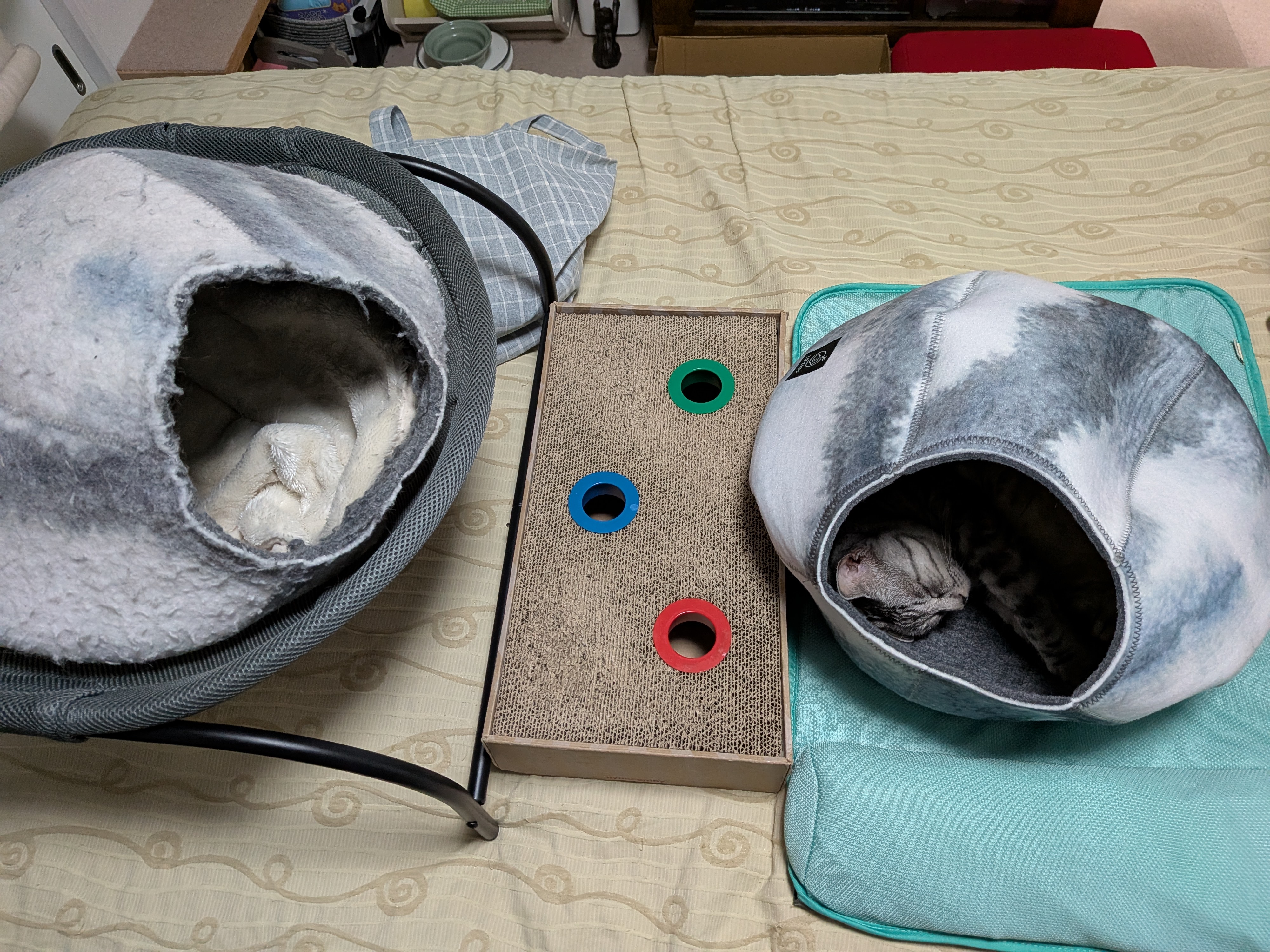 0歳の冬を越すために購入して早や6年。入り口の毛羽立ちが目立ったり奥の生地が薄くなって透け始めたりしてきました。お得になっていたので思い切って新しいのを購入しました。並べて置いたら迷うことなく新しい方に入って出てこないナナ。嬉しそうでした。後日、古い方も捨てがたくて別の部屋に置いたら、時たま入ってグーグー寝てます。