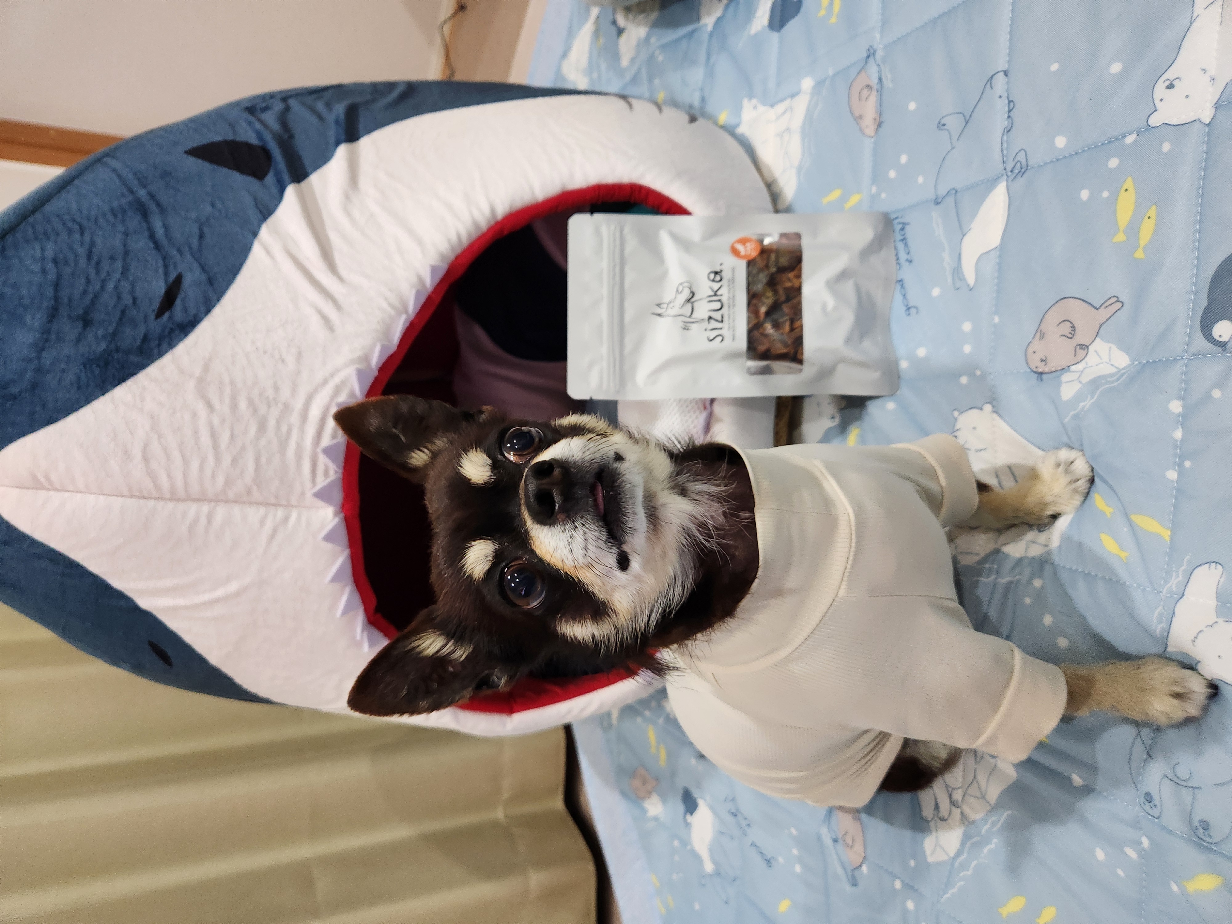 おやつを頼む時は必ずリピートします。今回も2袋を頼んであげました。一口大に切ってあげます。食べる時は見ていてあげます。危ないからです。