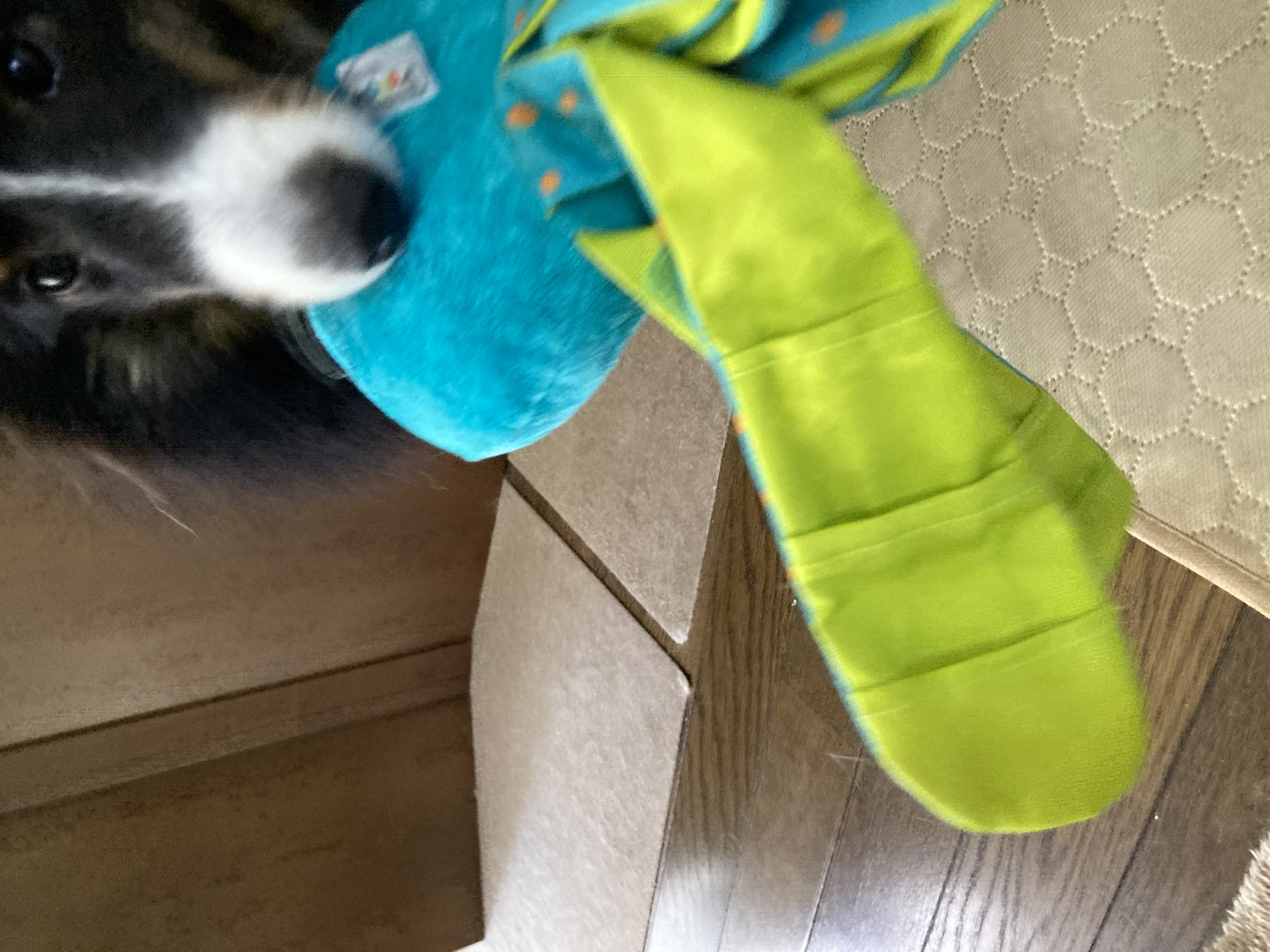 今まで持っているおもちゃにはない形(足がブラブラしてる)が興味深々で、足の中に忍ばせたおやつの匂いになんとか取れないかと鼻を入れてみるけれど、ジェミちゃんの鼻はなかなか入らなくて苦戦、頭を上手に鳴らしたり、振り回したり、色々遊べました!