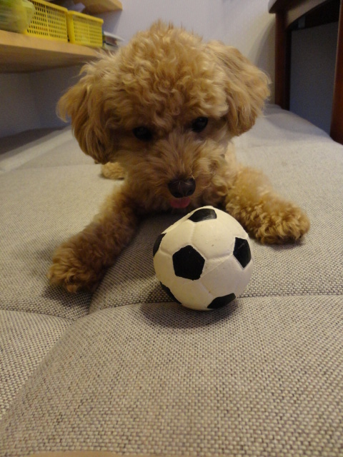 大玉転がしのイメージだったのですが、口にくわえる事が出来るちょうど良いサイズでした。 穴があいていますので、そこから「シュコシュコ」音が出ますし、くわえた時は空気が抜けるので、くわえやすいようです。 自分で転がして遊んだり、こちらが投げて持ってこさせたりして遊んでいます。