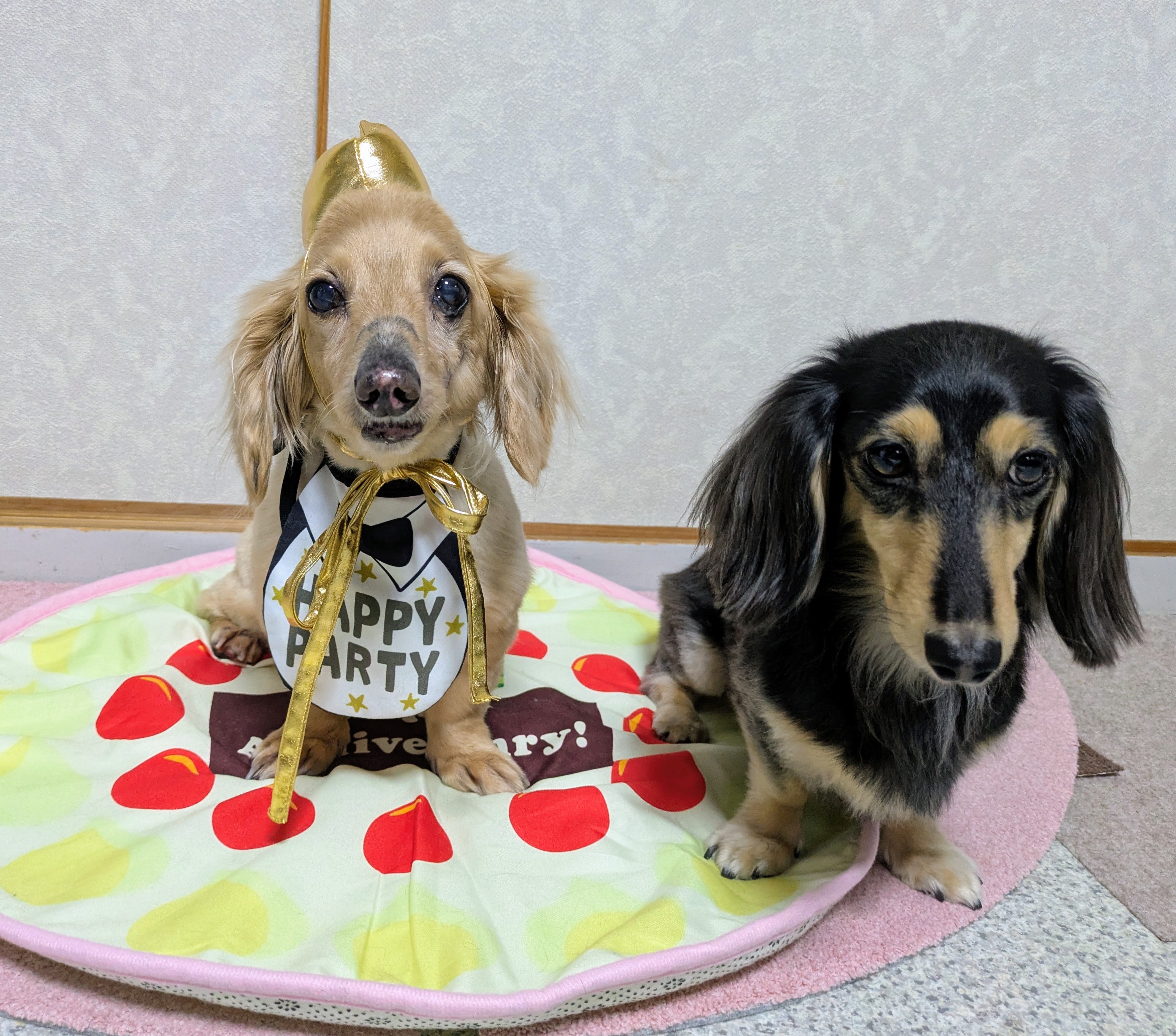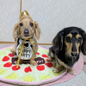 写真のタイトルは「ハッピーバースデー!」で、 ペットのお名前は「チッピー&あんず ちゃん」、この犬の種類は、カニヘンダックスフンドだそうです。