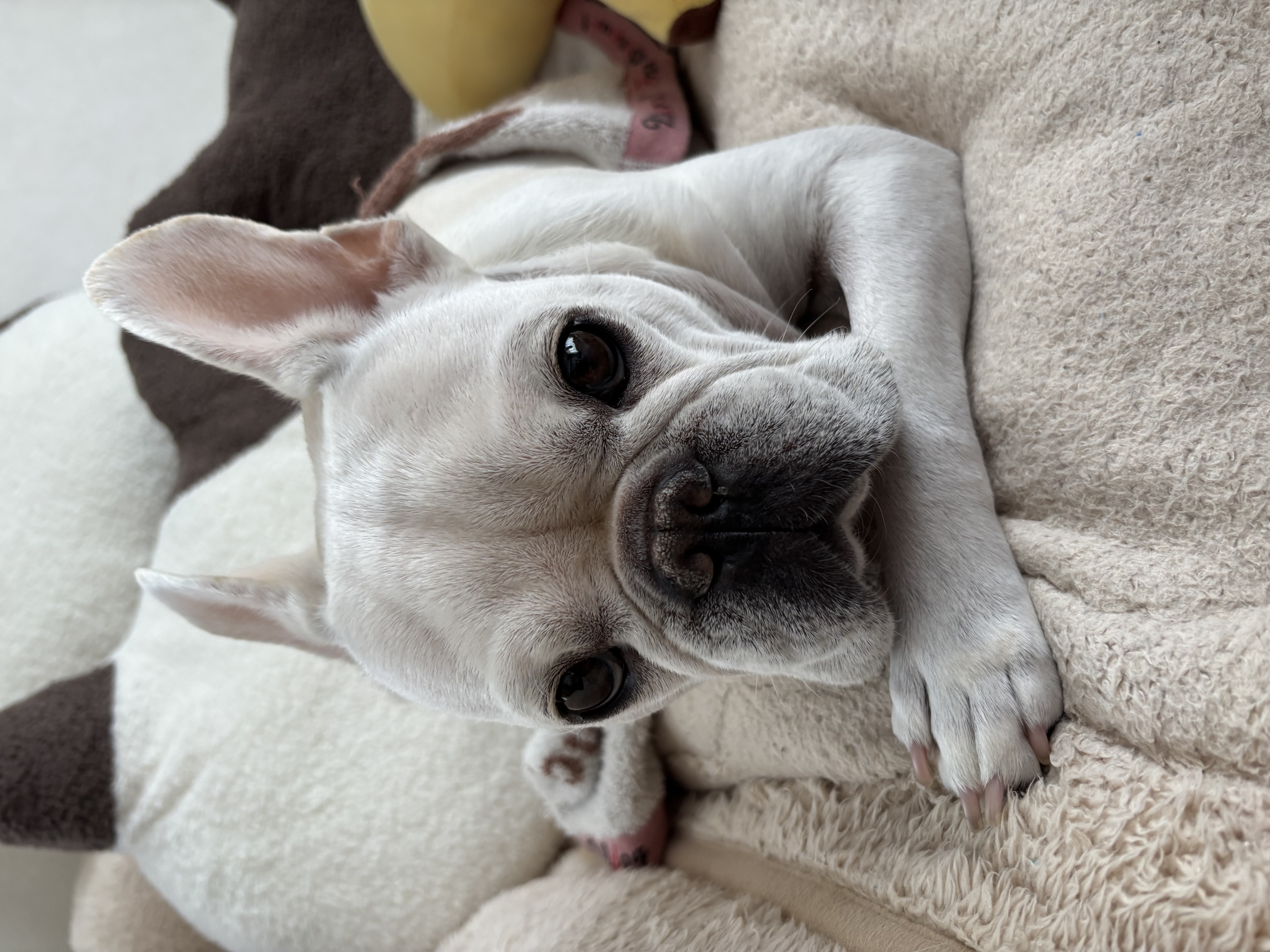 写真のタイトルは「何か用ですか?」で、 ペットのお名前は「こころ ちゃん」、この犬の種類は、フレンチ・ブルドッグだそうです。