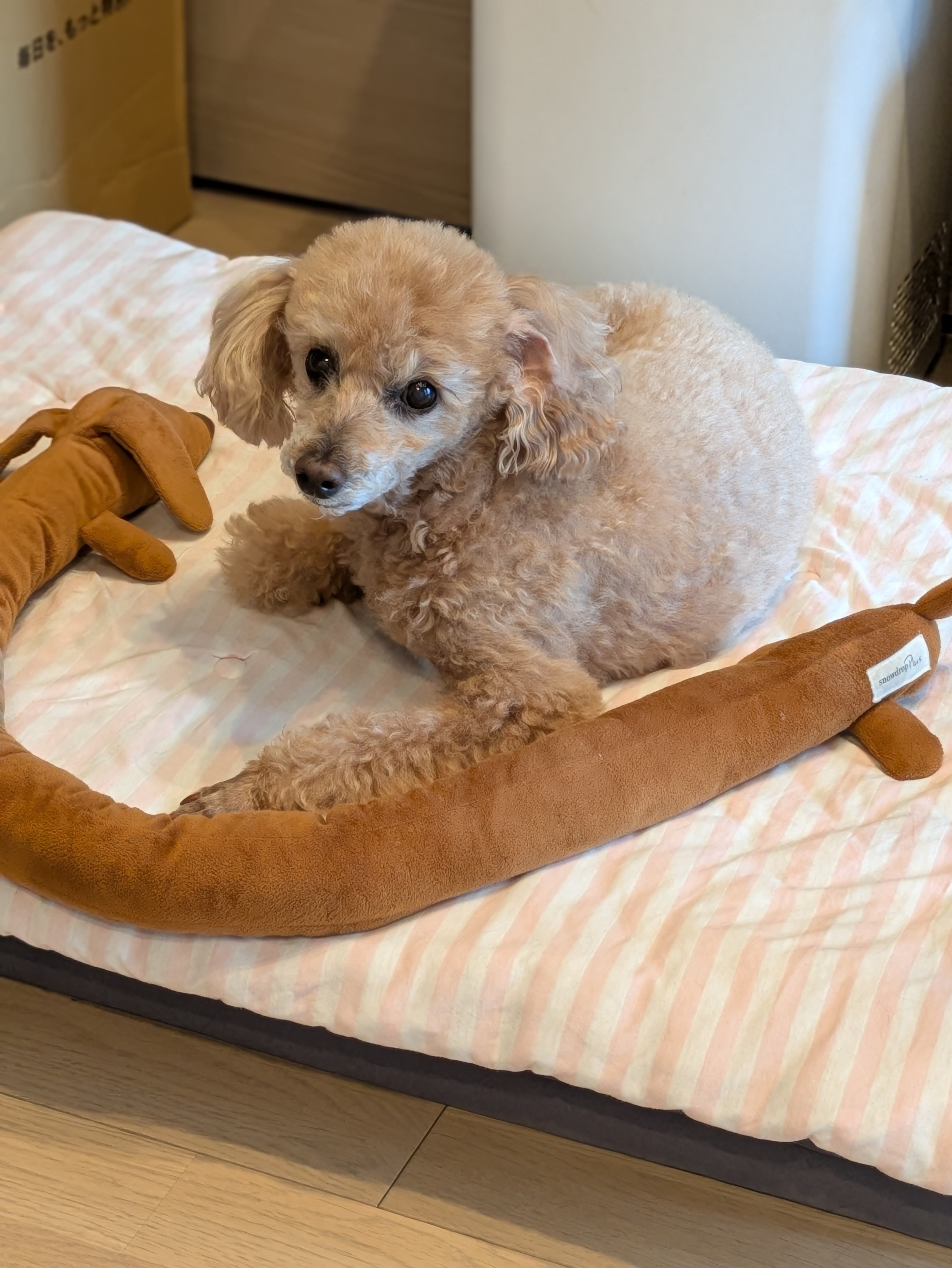 写真のタイトルは「うちの子になってくれて、ありがとう」で、 ペットのお名前は「茶々丸 ちゃん」、この犬の種類は、トイプードルだそうです。