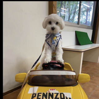 ママやお兄ちゃん達みたいに自動車を運転できるように、ボクも車の運転を練習してみたよ!(ポーズだけです)仮免許も無理かも…